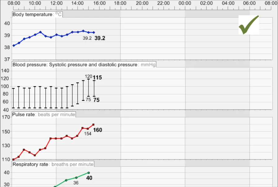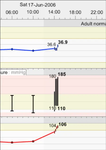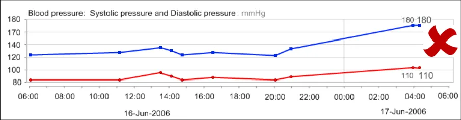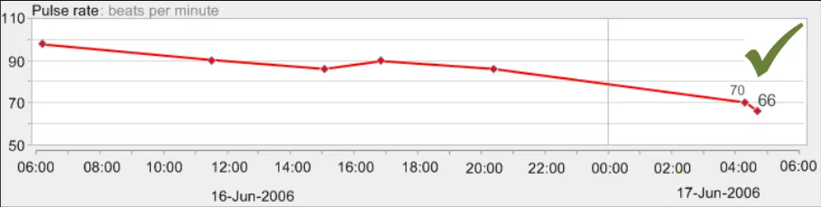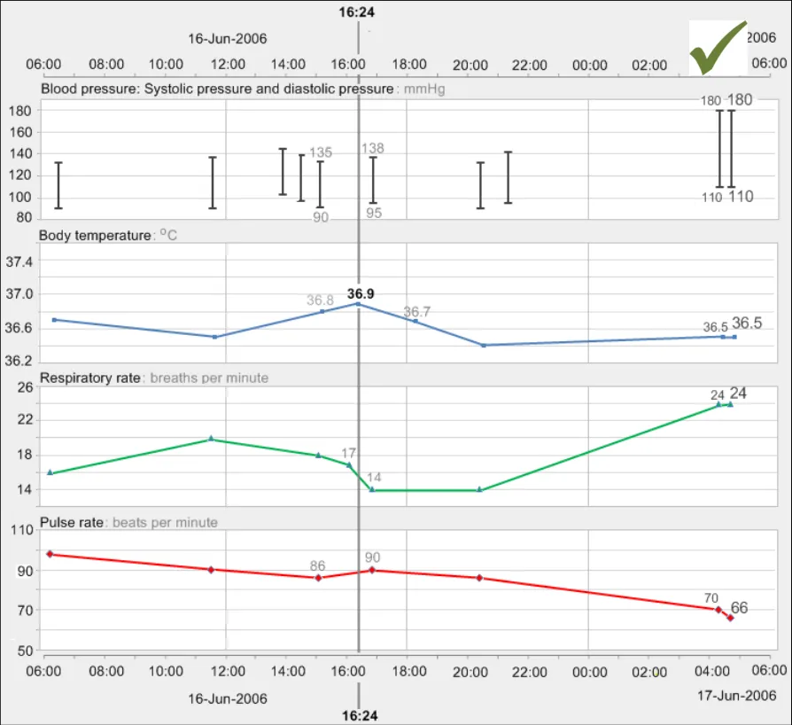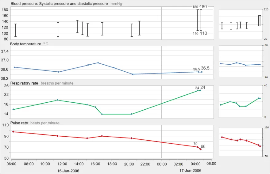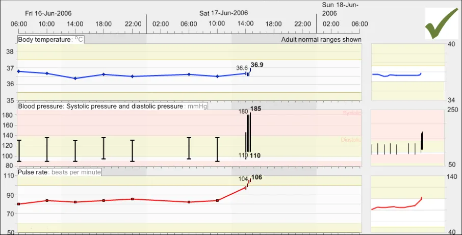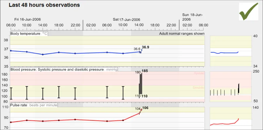 On the second reading the nurse finds the blood pressure is increasing with an increased pulse rate and informs the doctor who then reviews the last day’s observations with the current ones.