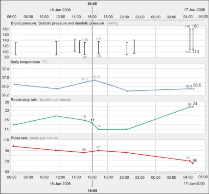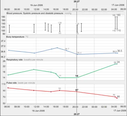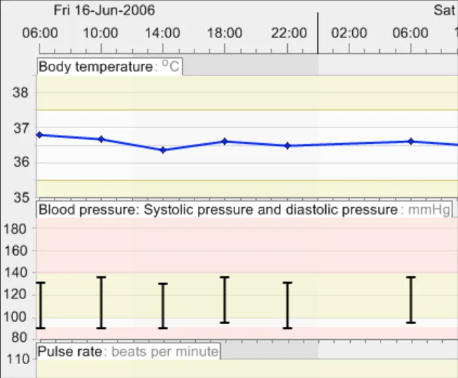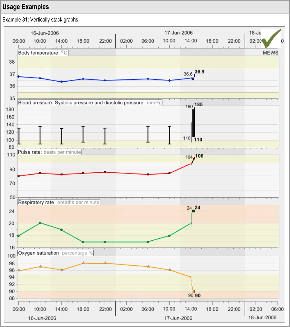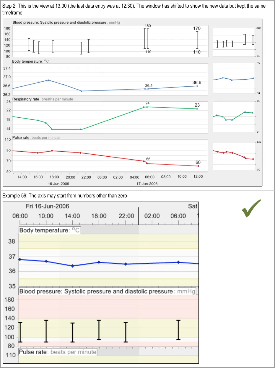 Clinical data represented numerically, such as physiological observations or ‘vital signs’ readings, play a crucial role in clinical decision-making and in communicating with patients, which in turn can influence patient involvement with their treatment regimen. In addition to accurately reading such numerical data, clinicians must also interpret patterns in the data to assess the patient’s status and to determine the best course of action. This often requires them to rapidly assimilate multiple series of data. Often, these patterns are difficult to spot initially, but become more distinct as a pathology develops and it is imperative that clinicians can detect them as early as possible. Pattern detection is a universal human capacity which people tend to do very efficiently and often subconsciously. However, the detection and meaning of a data pattern can be heavily influenced by the way in which the data is presented, and misinterpretation may occur if the data is not presented in a way that clinicians can easily understand.