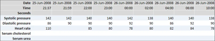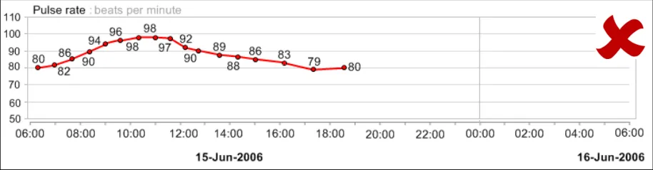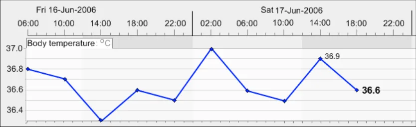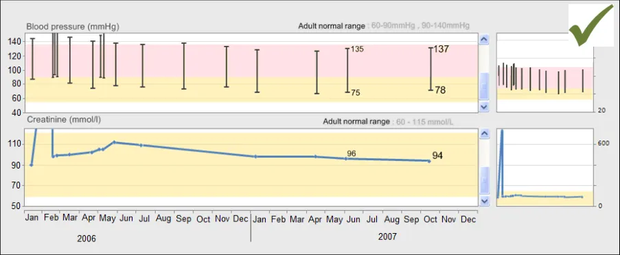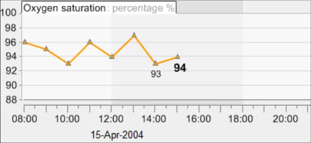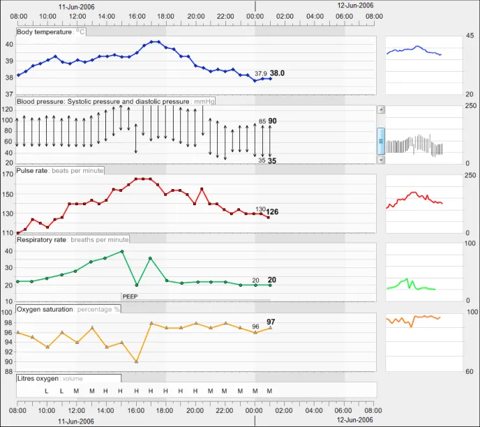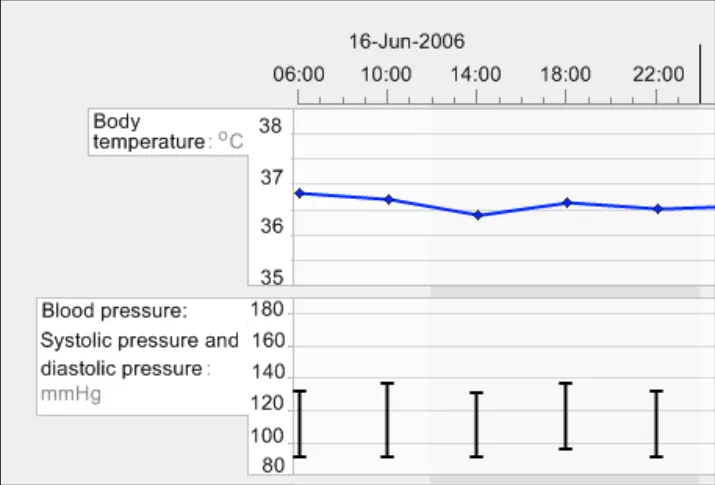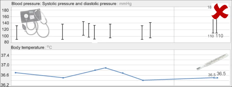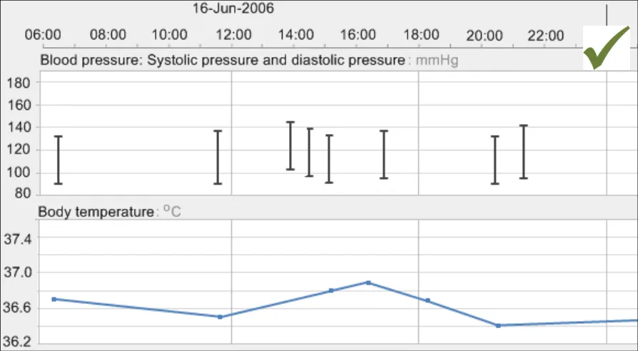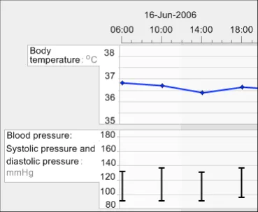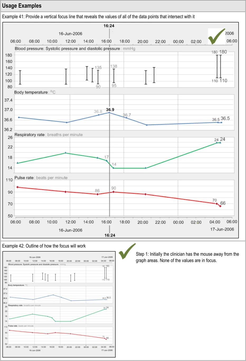 Clinical data represented numerically, such as physiological observations or ‘vital signs’ readings, play a crucial role in clinical decision-making and in communicating with patients, which in turn can influence patient involvement with their treatment regimen. In addition to accurately reading such numerical data, clinicians must also interpret patterns in the data to assess the patient’s status and to determine the best course of action. This often requires them to rapidly assimilate multiple series of data. Often, these patterns are difficult to spot initially, but become more distinct as a pathology develops and it is imperative that clinicians can detect them as early as possible. Pattern detection is a universal human capacity which people tend to do very efficiently and often subconsciously. However, the detection and meaning of a data pattern can be heavily influenced by the way in which the data is presented, and misinterpretation may occur if the data is not presented in a way that clinicians can easily understand.