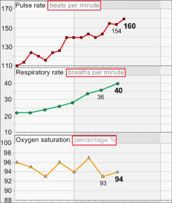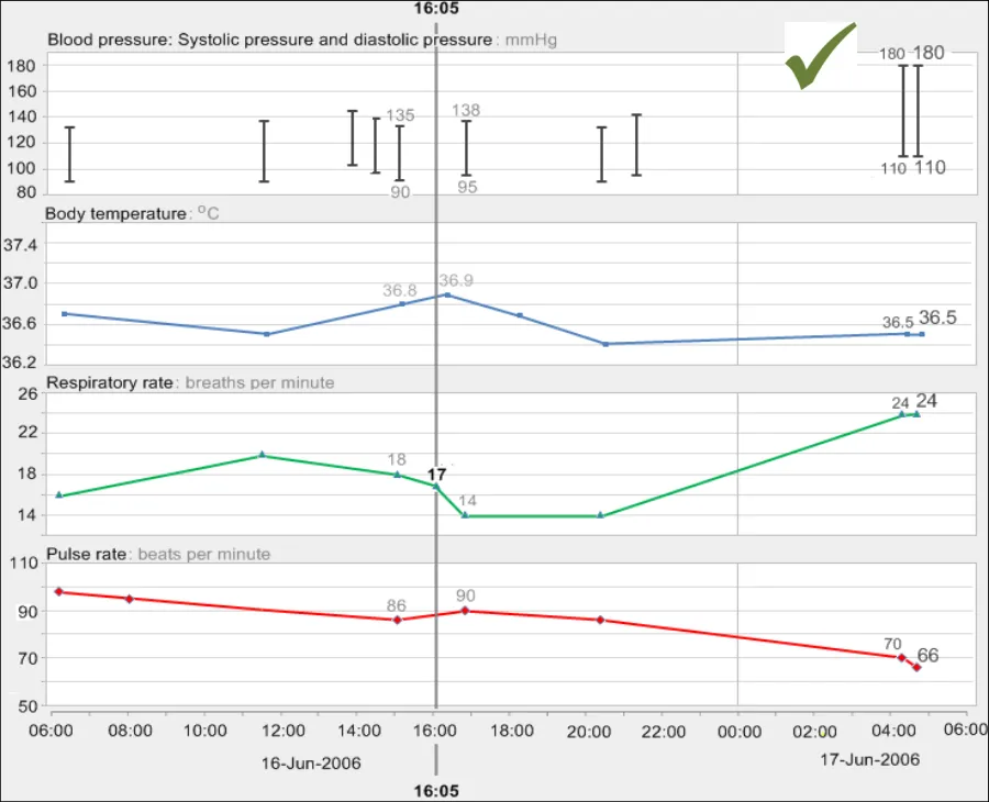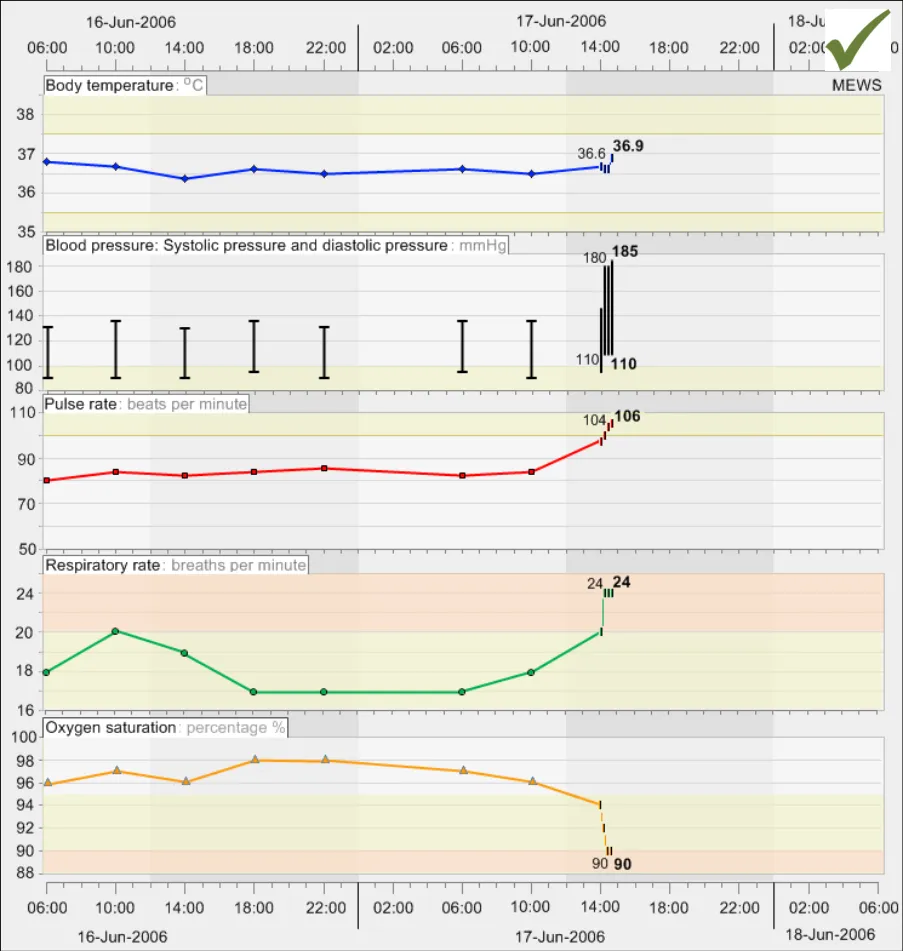 Variation 1: A nurse has been called to see an elderly inpatient who is very drowsy. The nurse views the patient’s chart and sees that the patient’s blood pressure has increased dramatically since the last set of readings, whereas their oxygen saturations have fallen.