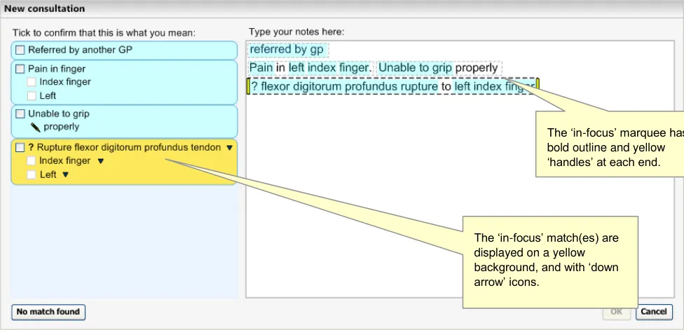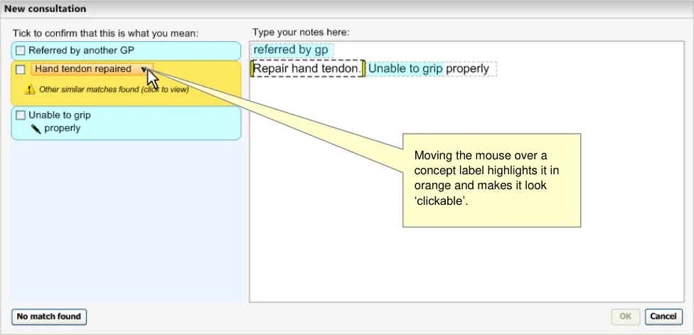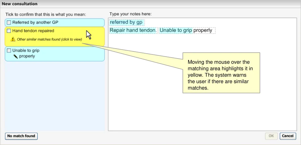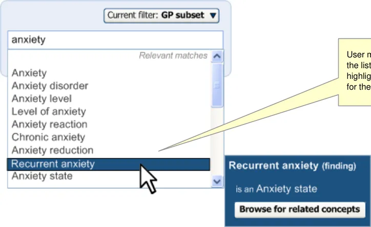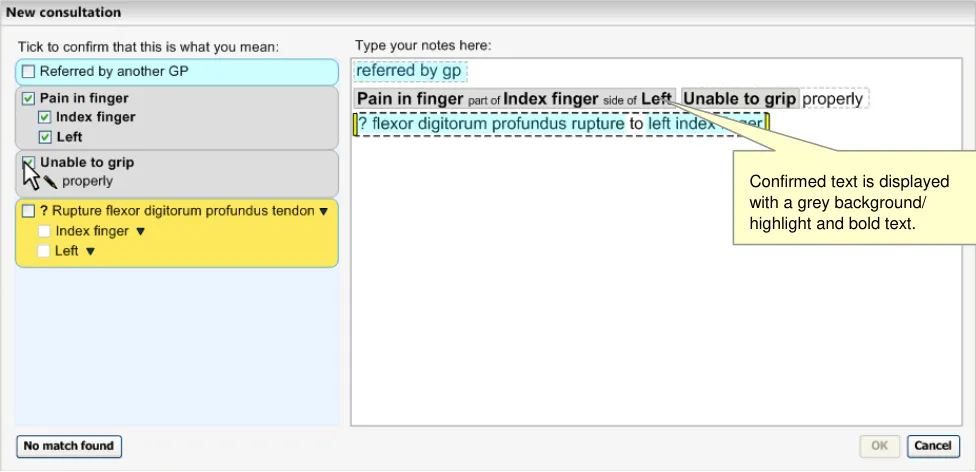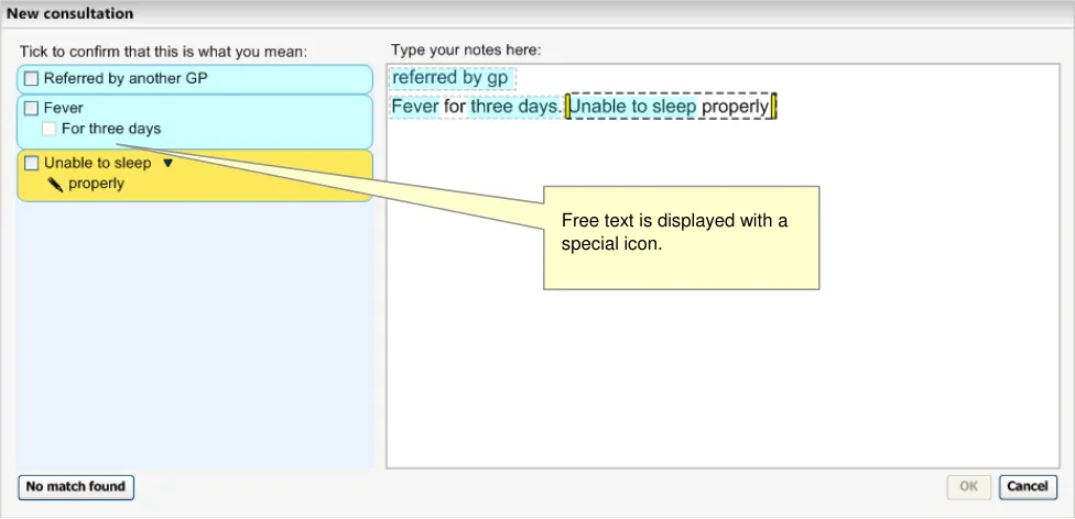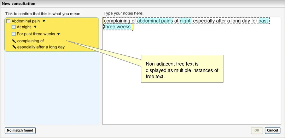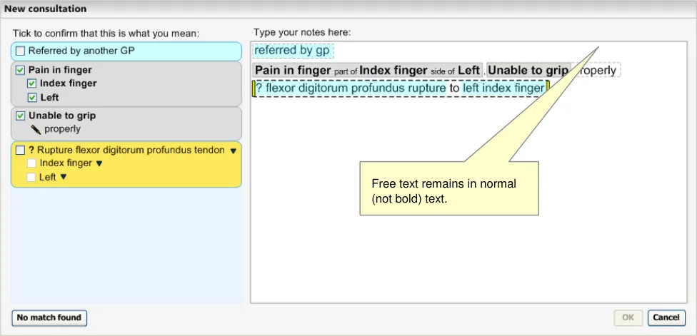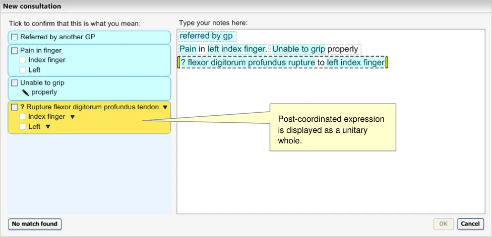 This becomes even more critical if the system displays ‘best matches’ (that is, predictive code matching). Users must be fully aware of what will be saved as a code and what will be saved as free text, and we have a requirement that all instances of encoded concepts must be confirmed by the user prior to committing them to the record; if not, the ‘concepts’ will remain as unstructured text.