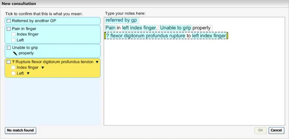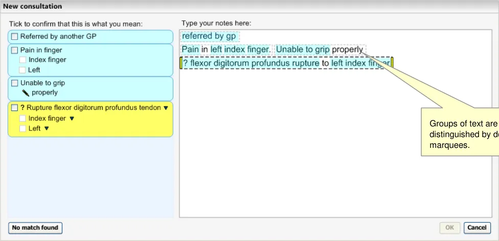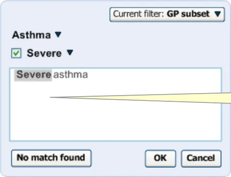 The user makes notes by selecting a clinical code, such as ‘asthma’, and elaborating it with other codes, such as ‘severe’ and unencoded text, such as ‘worse in cold weather’