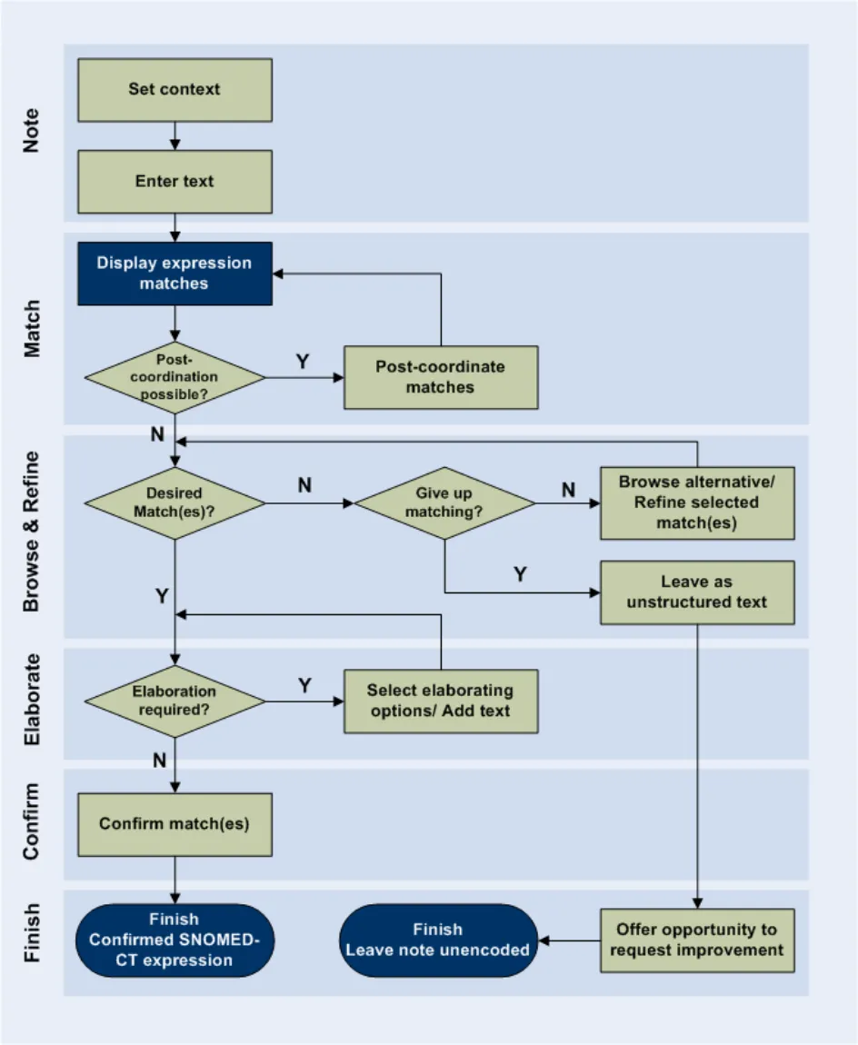 Encoding interfaces require components to identify and manage clinical terms within the text, as well as components to search for, and elaborate, clinical terms