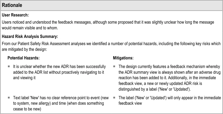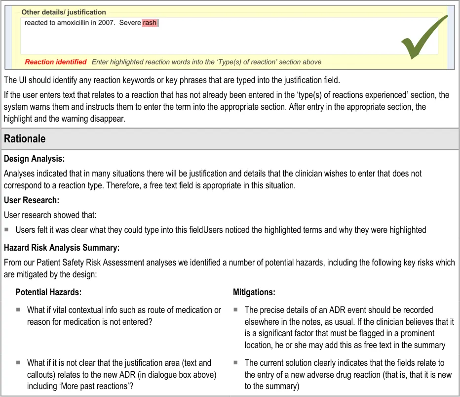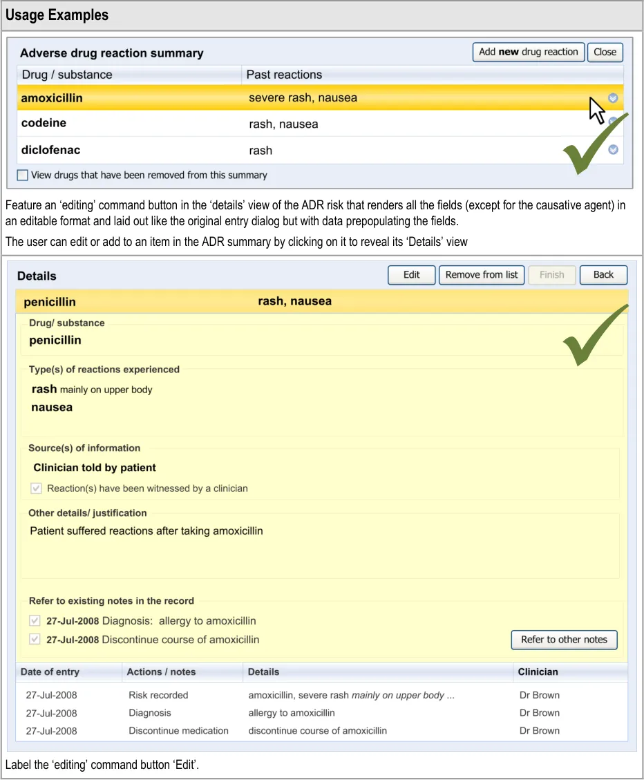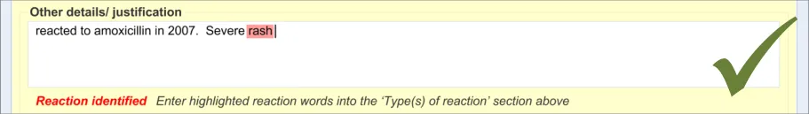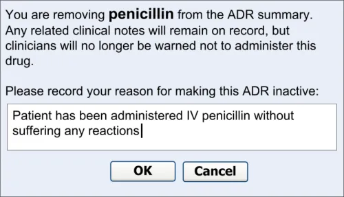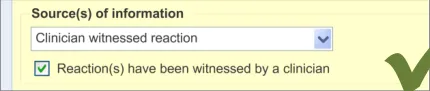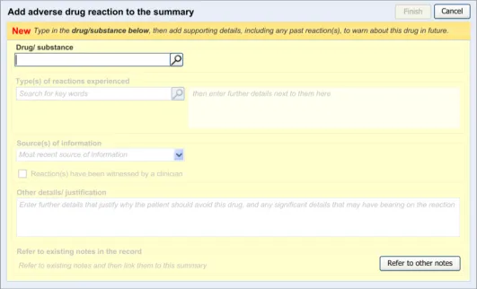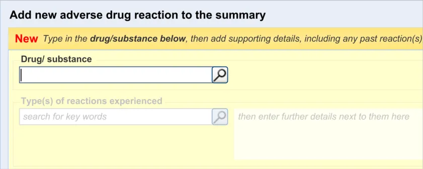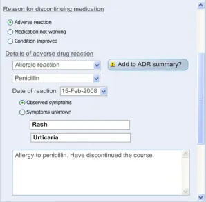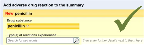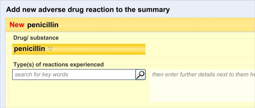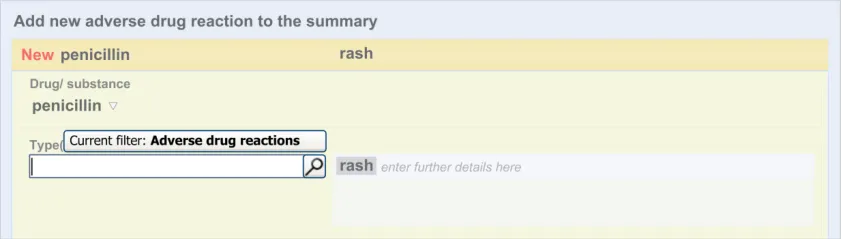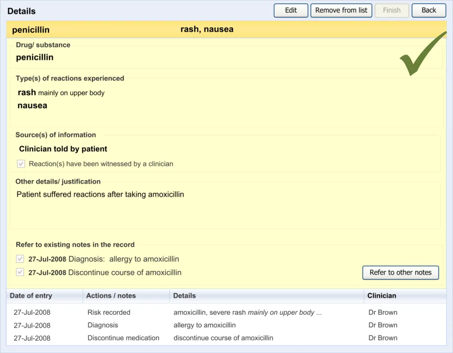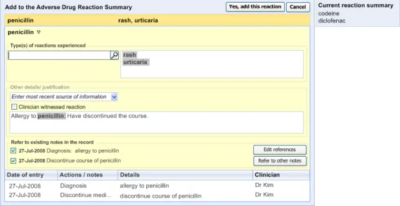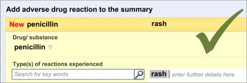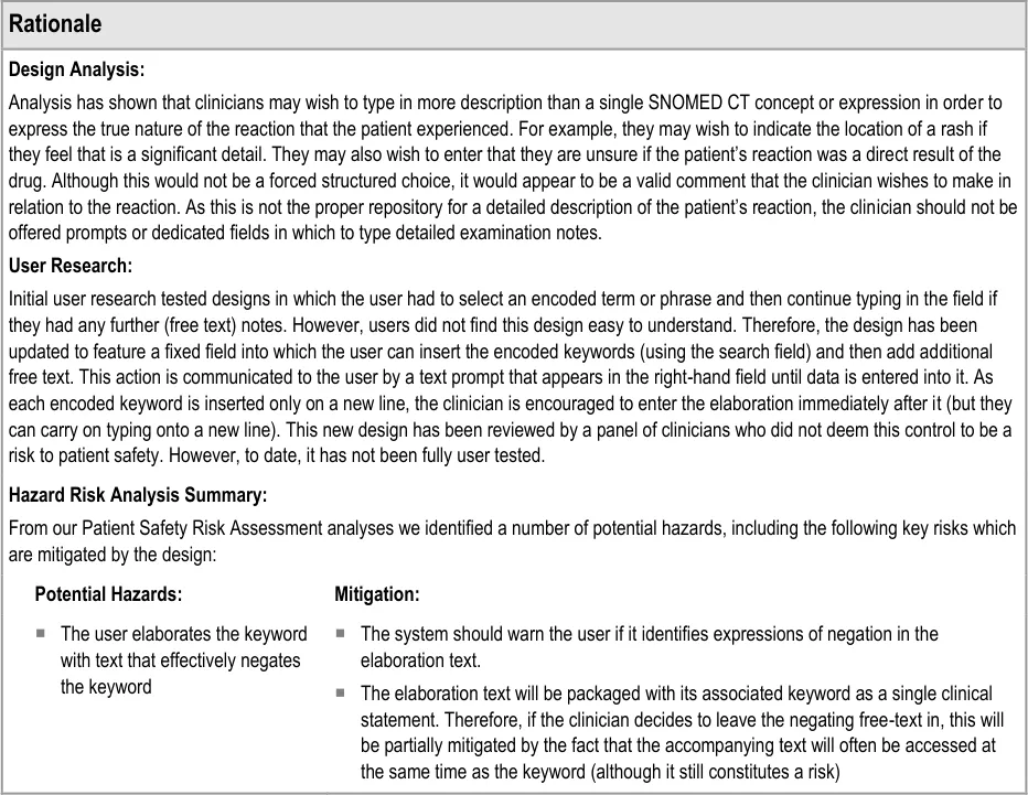 Suppliers of clinical noting systems should ensure that the clinician not only records a detailed description of any ADR events that they witness the patient experiencing (for example, as part of examination notes) but also that the clinician records if they believe that the patient is at risk of suffering a future reaction if they take the drug again.