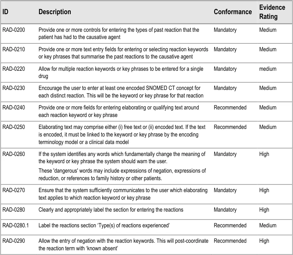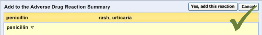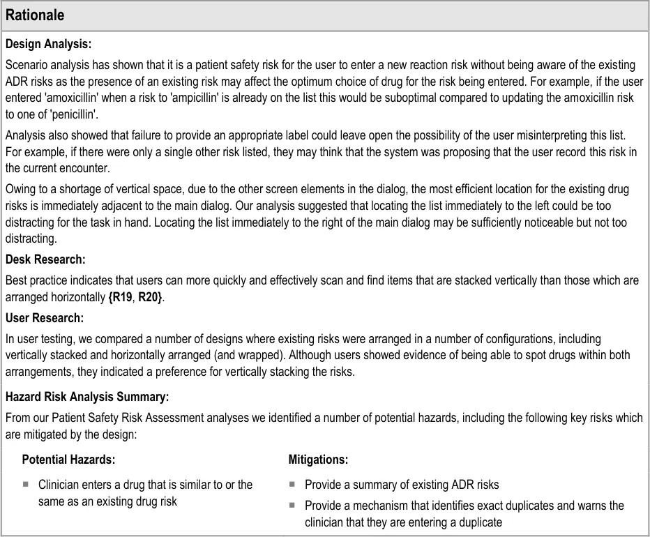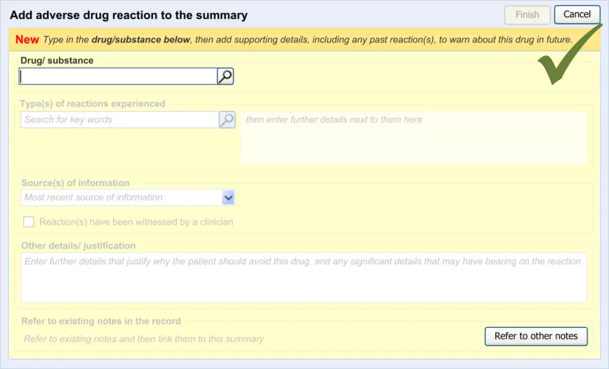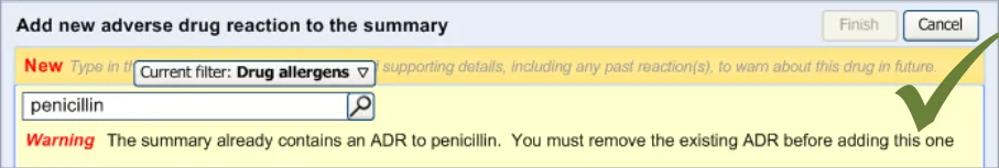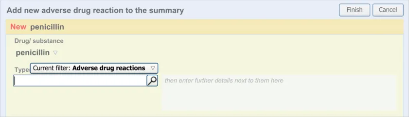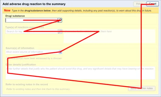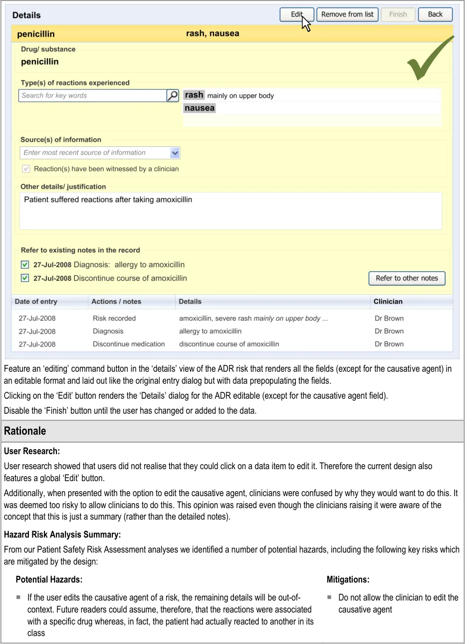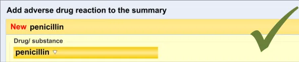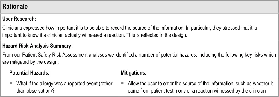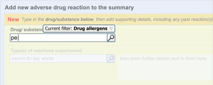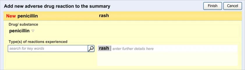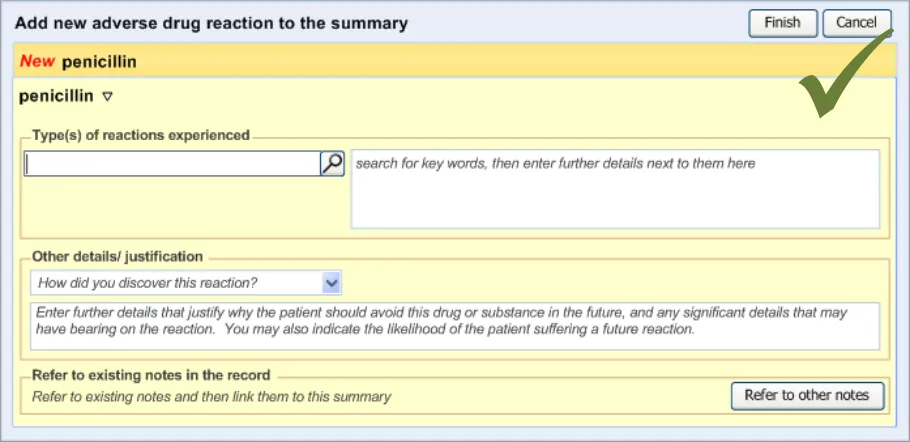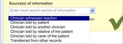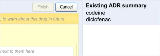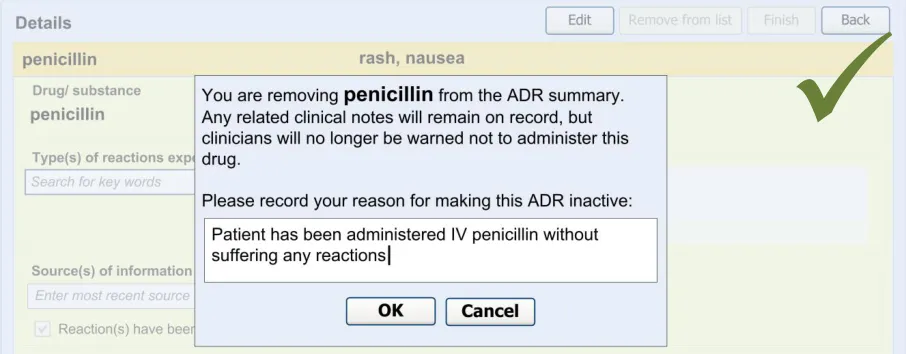 Suppliers of clinical noting systems should ensure that the clinician not only records a detailed description of any ADR events that they witness the patient experiencing (for example, as part of examination notes) but also that the clinician records if they believe that the patient is at risk of suffering a future reaction if they take the drug again.