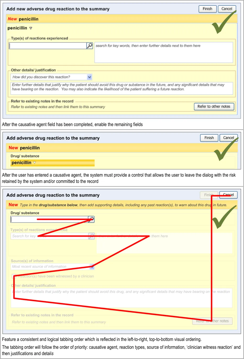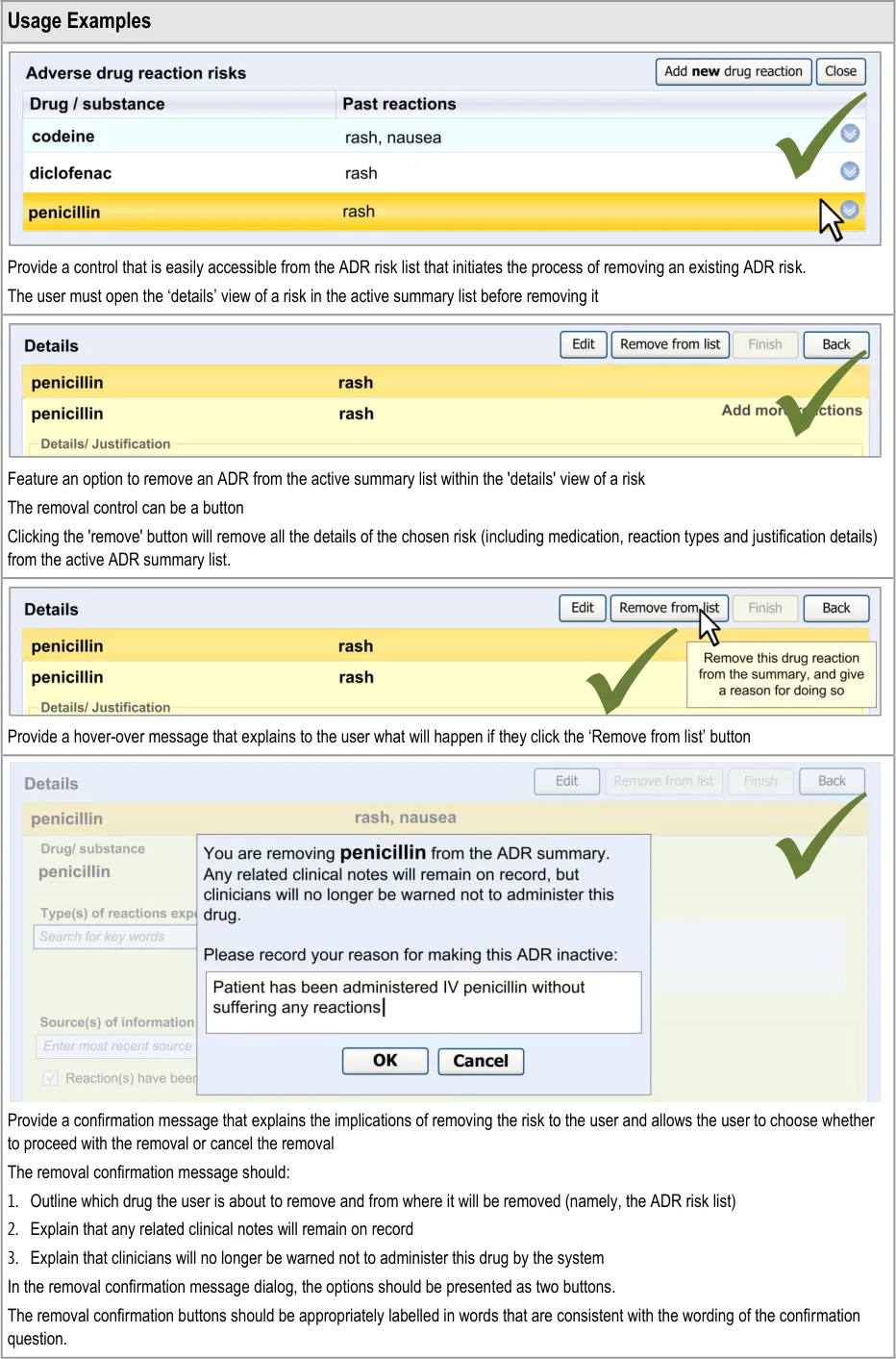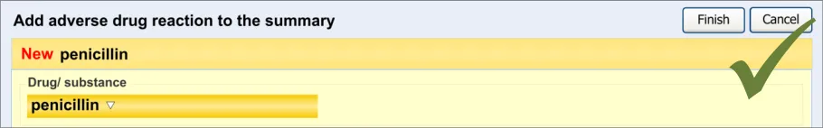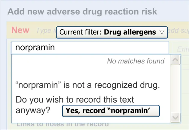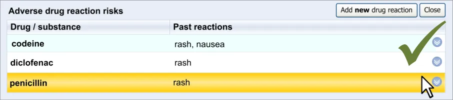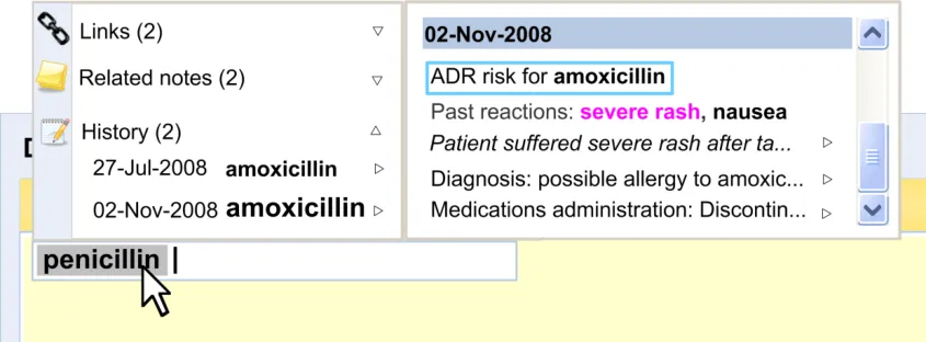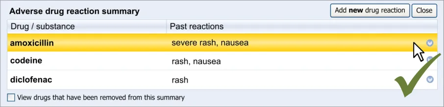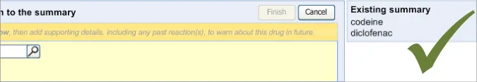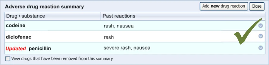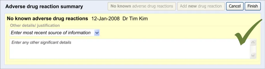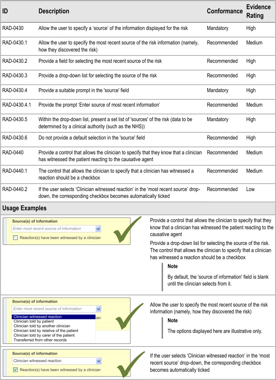 Suppliers of clinical noting systems should ensure that the clinician not only records a detailed description of any ADR events that they witness the patient experiencing (for example, as part of examination notes) but also that the clinician records if they believe that the patient is at risk of suffering a future reaction if they take the drug again.