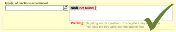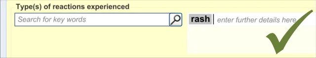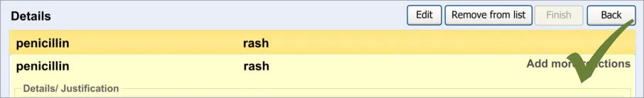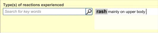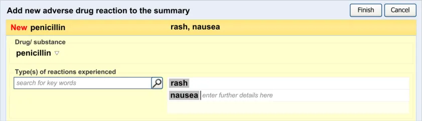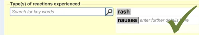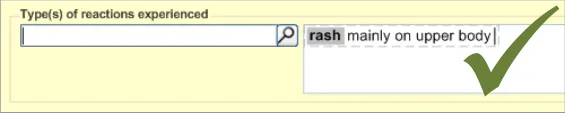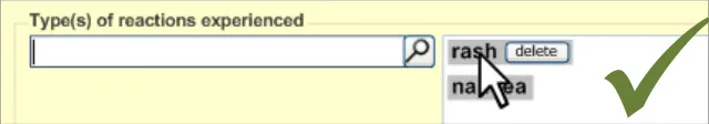 - May enter a list of reactions (rash and nausea) in one reactions entry field (p13, p14, p17,