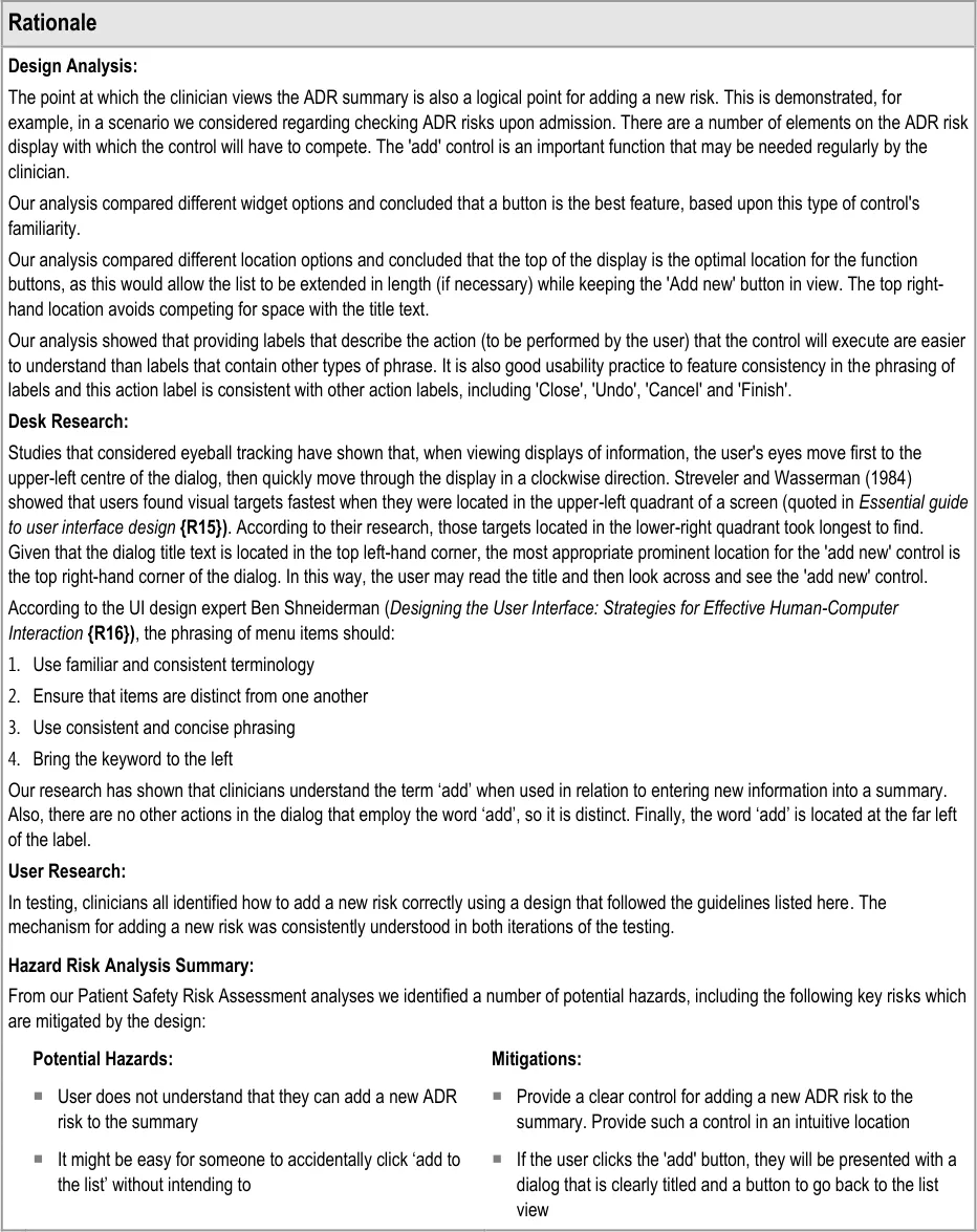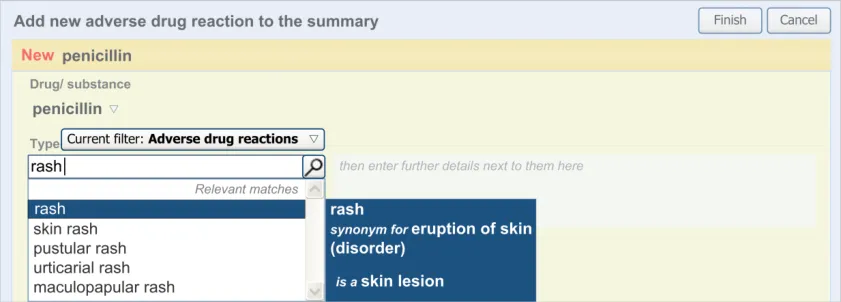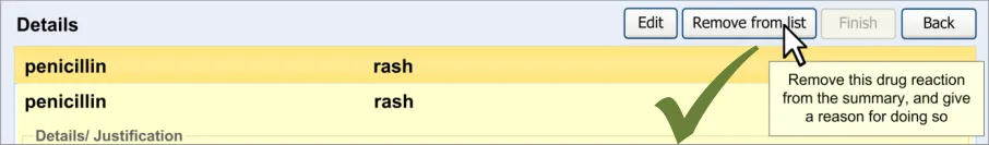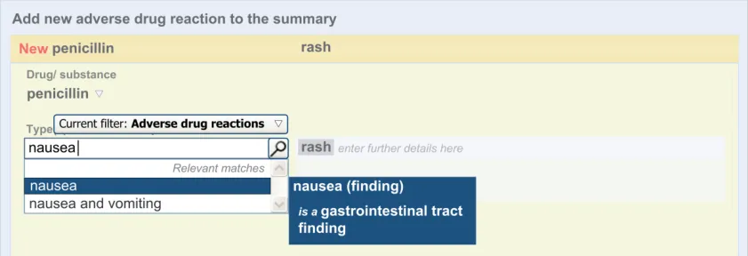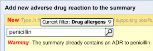Therefore, to the clinician who is using the user interface, the overall list is called the Adverse drug reaction summary (or Adverse drug reaction summary list ), and each line in the list corresponds to an Adverse drug reaction that the list summarises. Accordingly, clinicians will be required to perform the action of adding an ADR to the summary. To the clinician, the ADR is still an ADR; it is just that they are summarising it for the purposes of warning other clinicians.