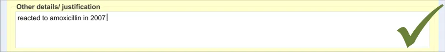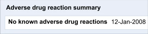 Where possible, the ADR risks listed in this area must be based upon empirical evidence (such as the clinician witnessing a reaction). This area does not replace the need to write detailed examination notes about ADRs elsewhere in the record. Nor should the clinician be expected to write detailed notes about the ADRs on the drug chart, as this detailed information would obstruct the important medication information and may not be necessary on most occasions