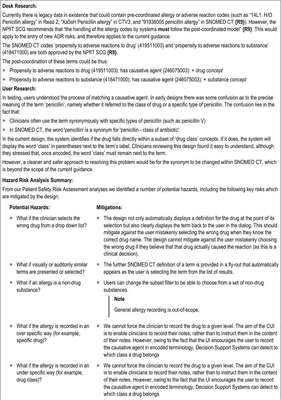 suggest that labelling in any user interface (UI) that is presented to the clinician employs the term ‘summary’. However, for the benefit of the readers of this guidance document, we shall still use the word ‘risk’ in order to distinguish it from the ADR ‘event’. This should make matters clearer to those responsible for ensuring that appropriate data is recorded during clinical noting.