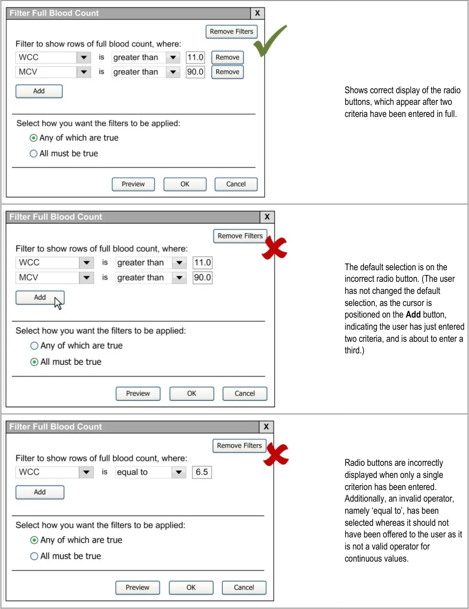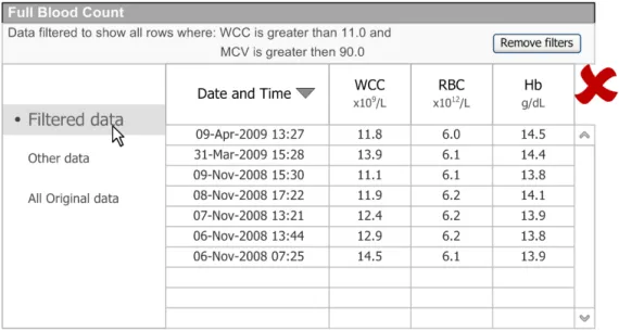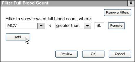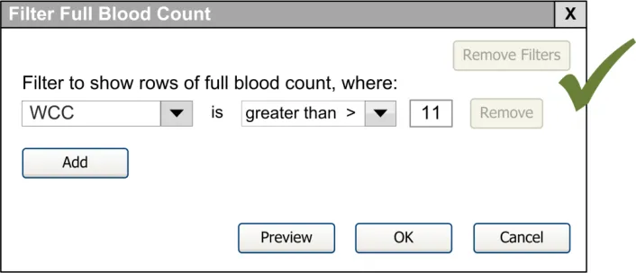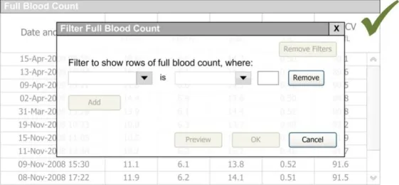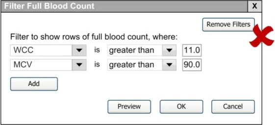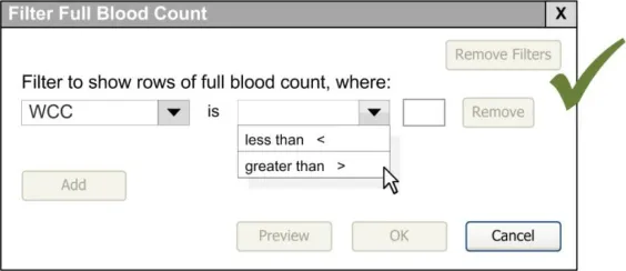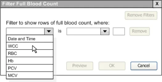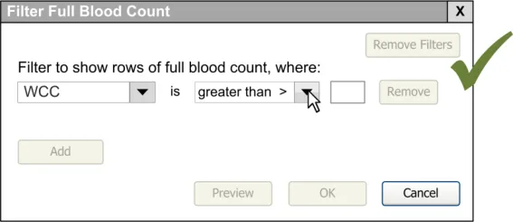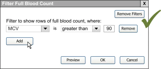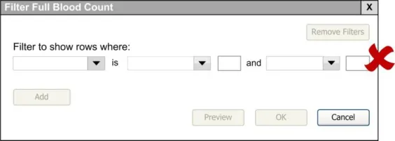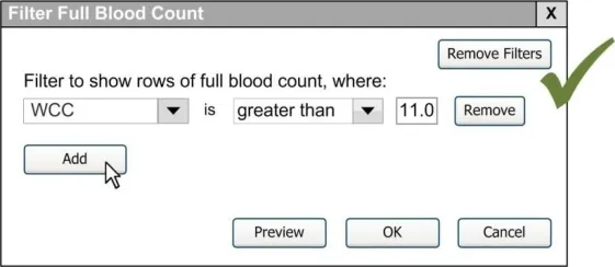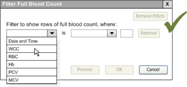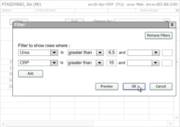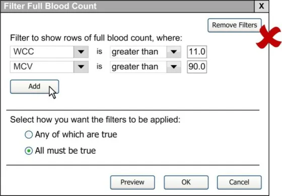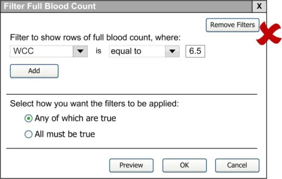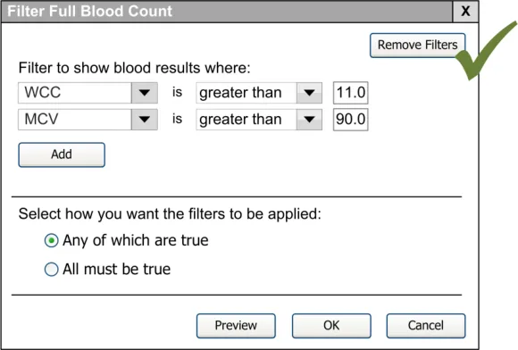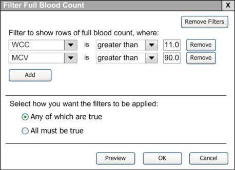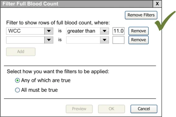 When subsequently shown Figure 16 all respondents were able to predict that the result of selecting an ‘all must be true’ filter was that the filter showed both a Urea value greater than 6.5 and a CRP value greater than 15. Most respondents (8/13) preferred the Figure 16 design because it made the action ‘ much clearer’ (p3) and provided them with a choice on how to combine the individual filters.