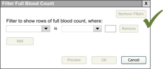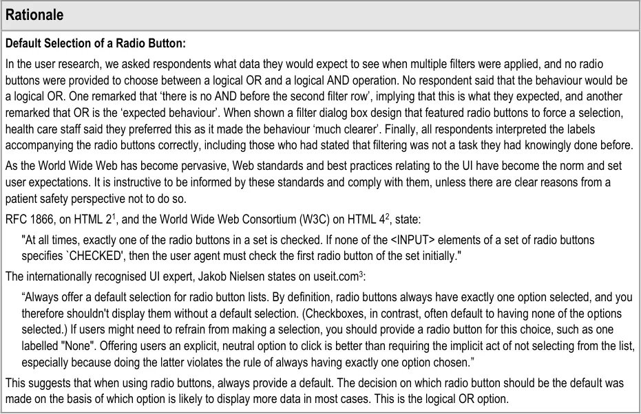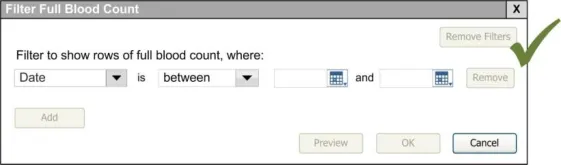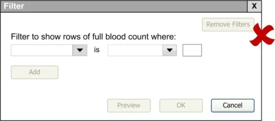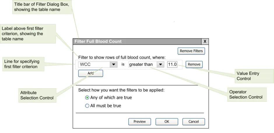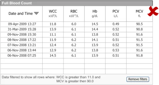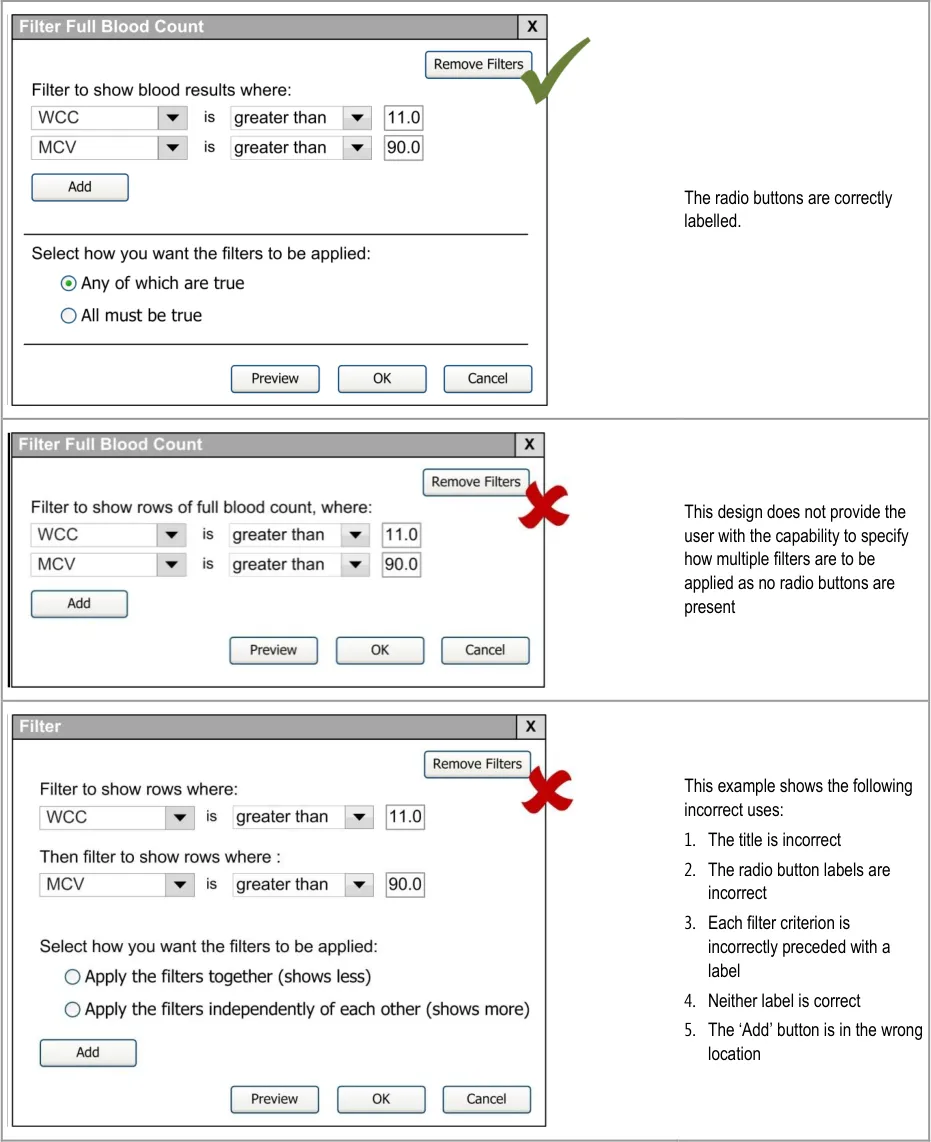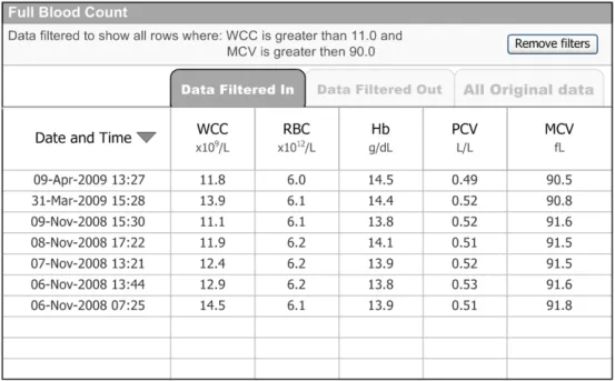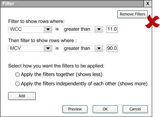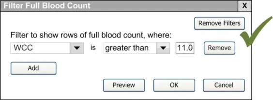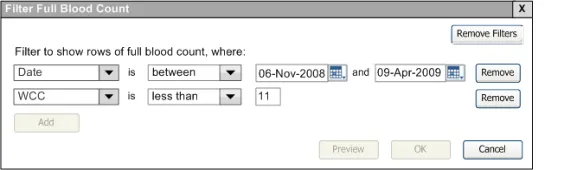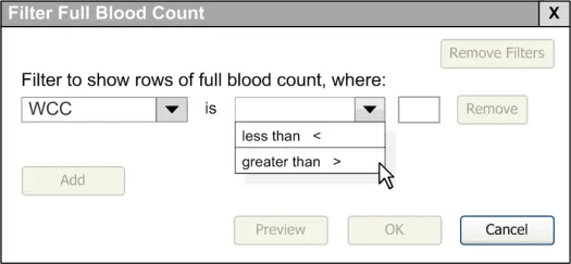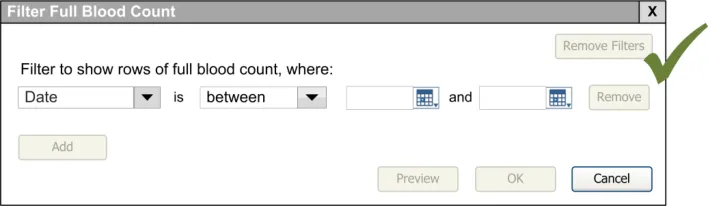 When subsequently shown Figure 16 all respondents were able to predict that the result of selecting an ‘all must be true’ filter was that the filter showed both a Urea value greater than 6.5 and a CRP value greater than 15. Most respondents (8/13) preferred the Figure 16 design because it made the action ‘ much clearer’ (p3) and provided them with a choice on how to combine the individual filters.
