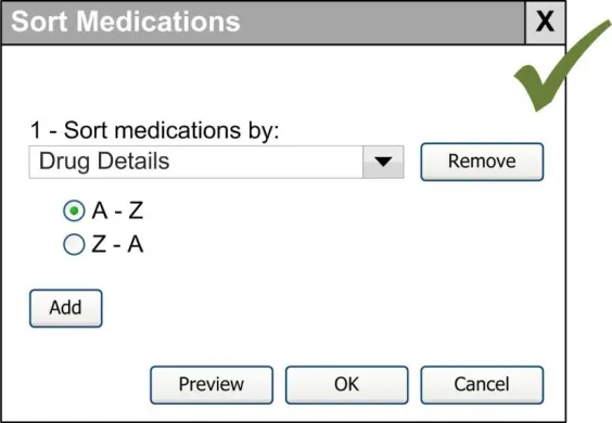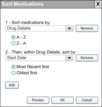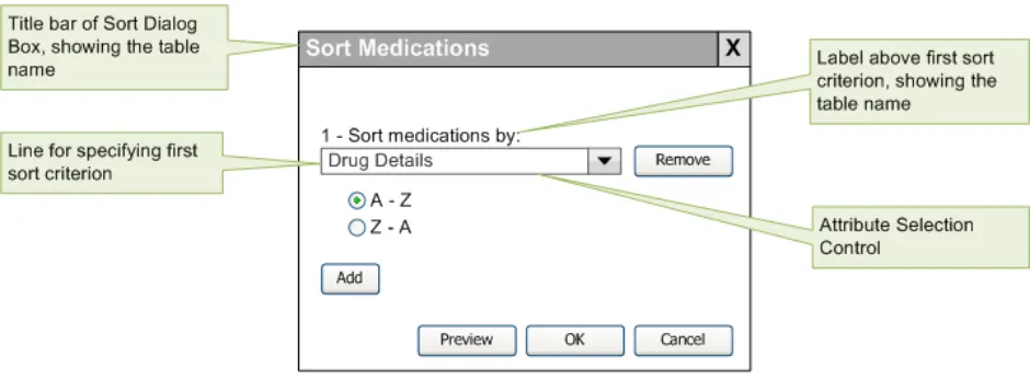Sorting To arrange elements of a sequence according to some criterion, such as alphabetically (A to Z), or numerically (1, 2, 3…). A clinical example is: ‘Show me all the medications this patient has ever been prescribed, in alphabetic order of medicine name’.