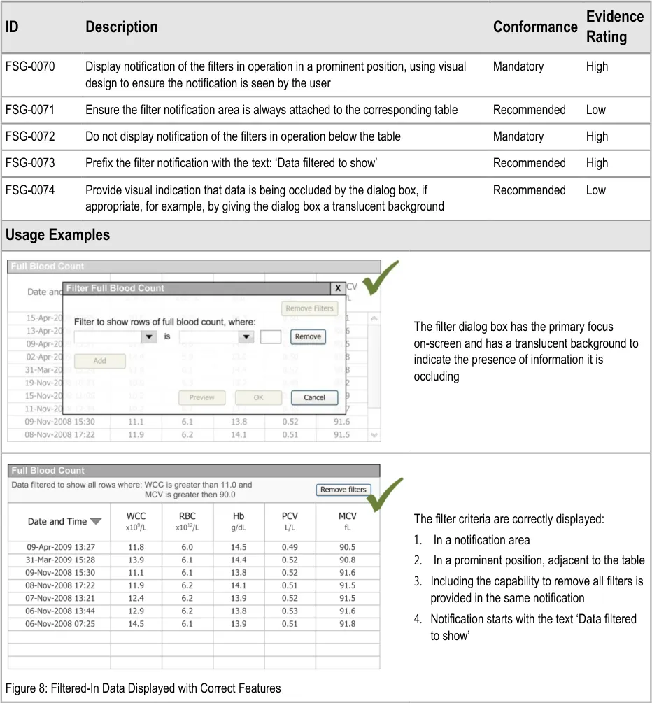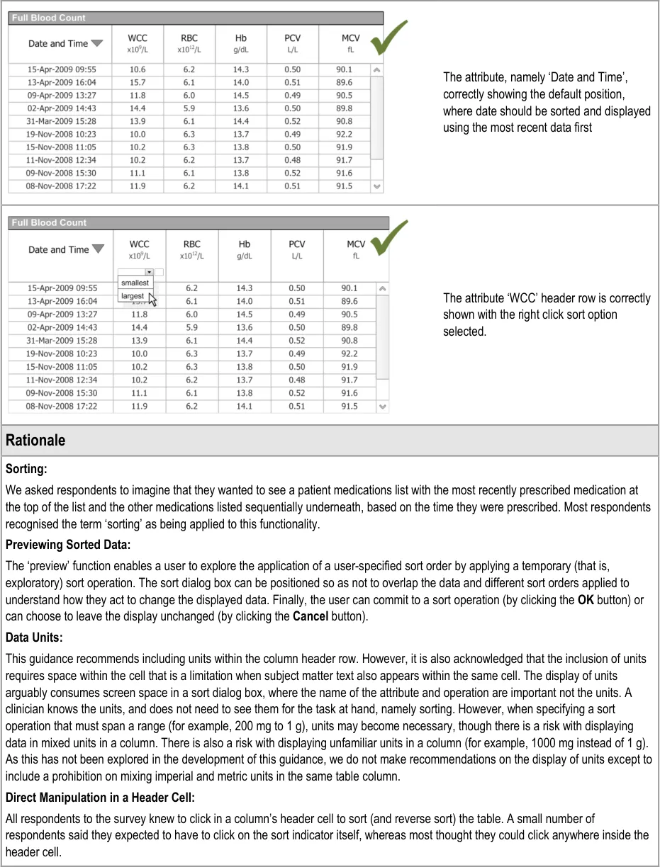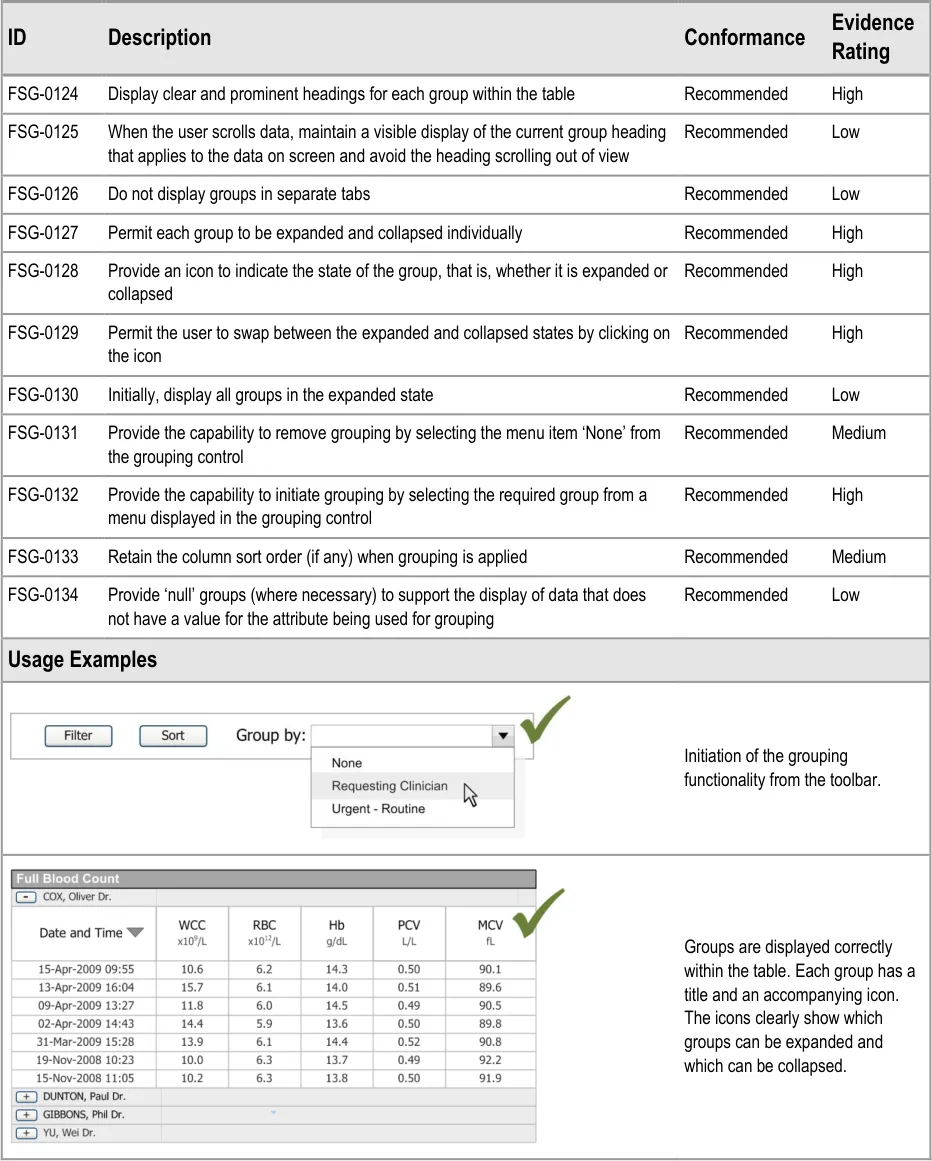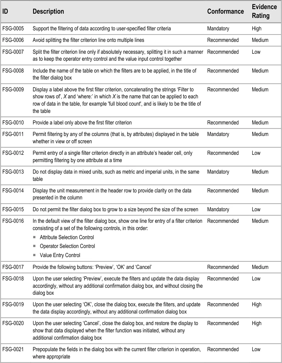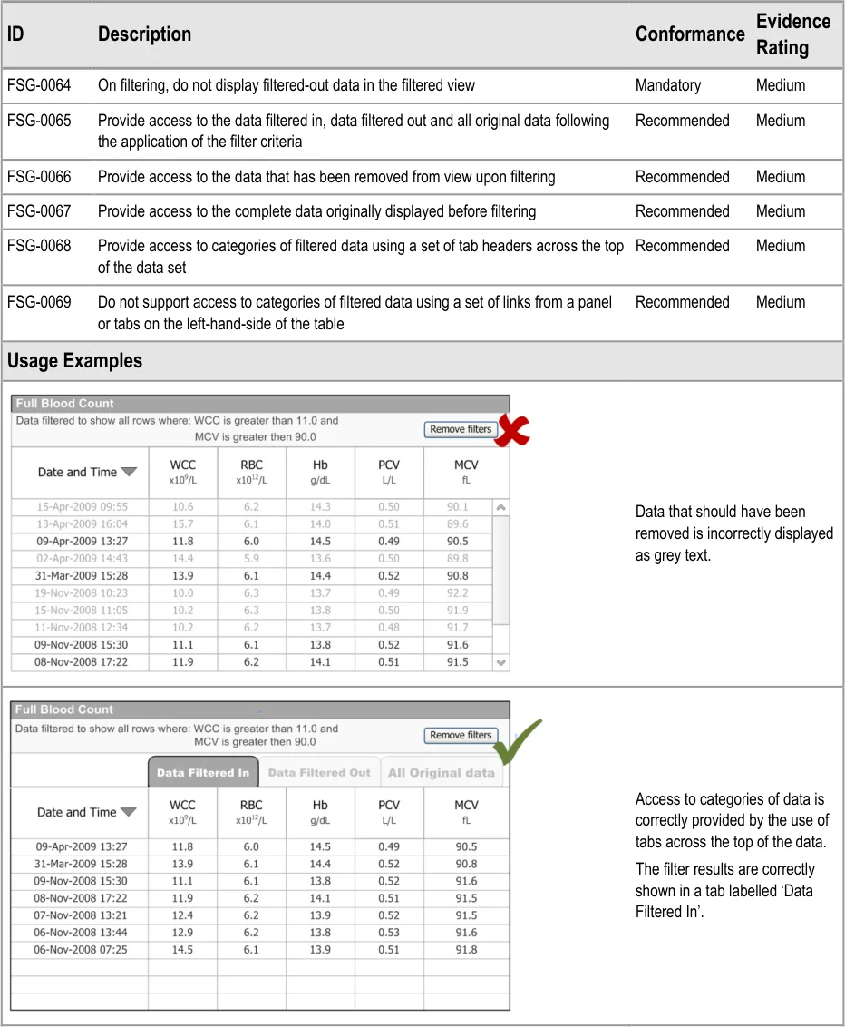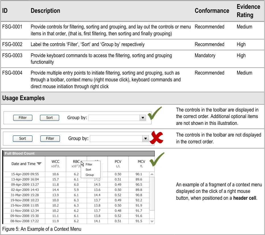 This document provides guidance for the design of application functionality to filter, sort and group any clinical data within a single patient record displayed in a tabular form. It describes the area of focus, lists mandatory and recommended guidance points with usage examples and explains the rationale behind the guidance.