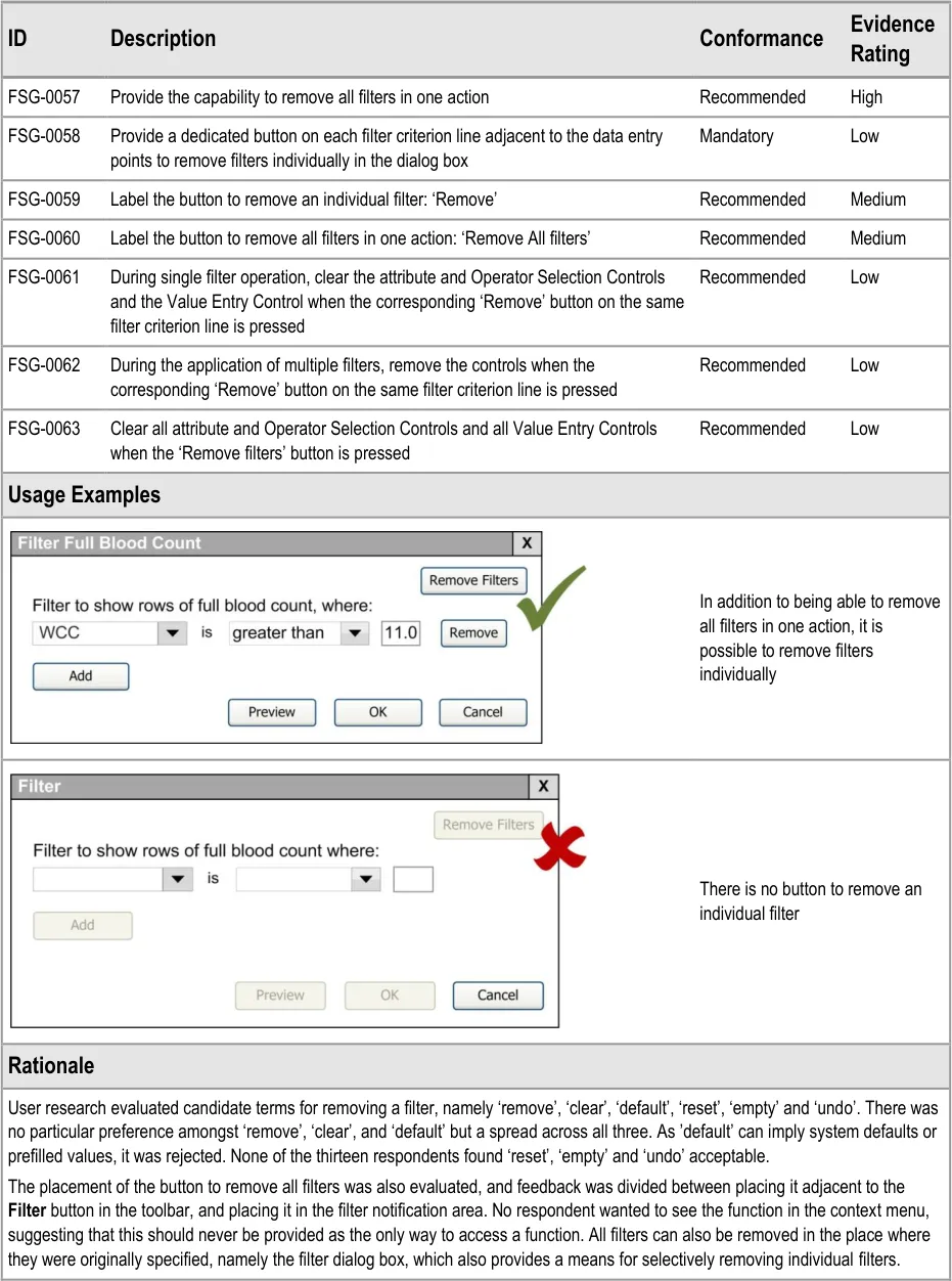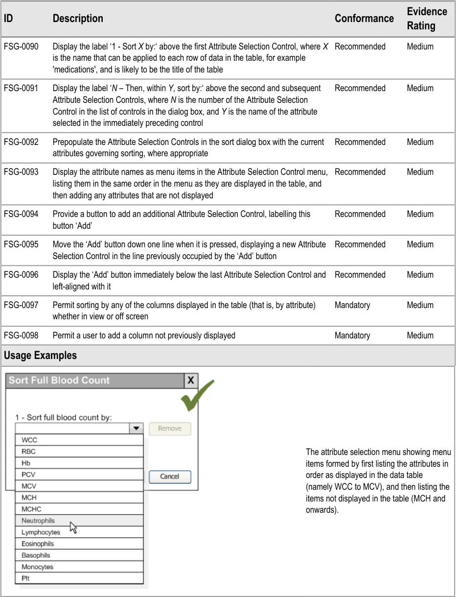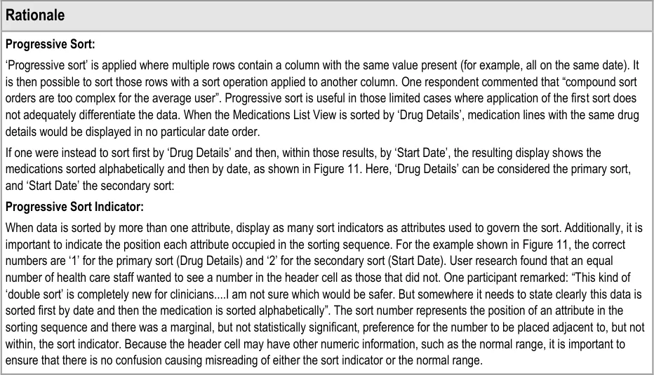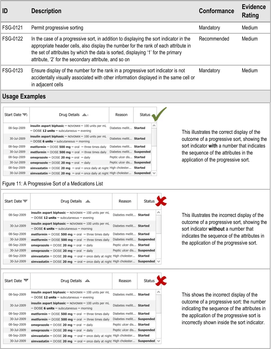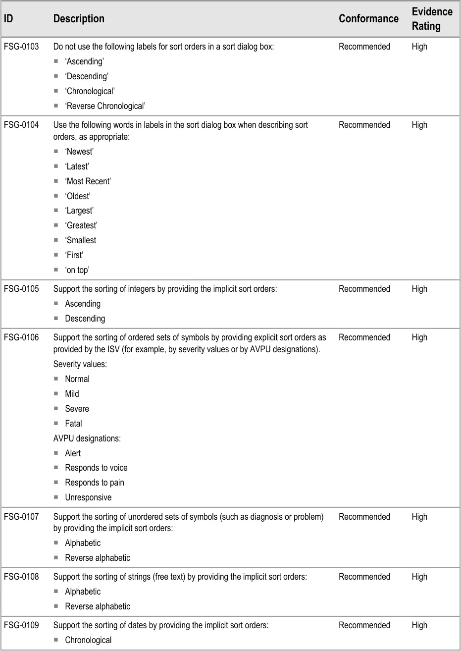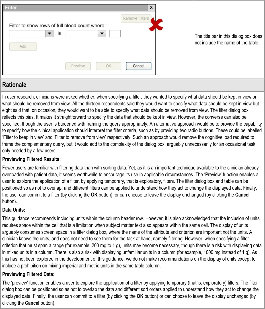 This document provides guidance for the design of application functionality to filter, sort and group any clinical data within a single patient record displayed in a tabular form. It describes the area of focus, lists mandatory and recommended guidance points with usage examples and explains the rationale behind the guidance.