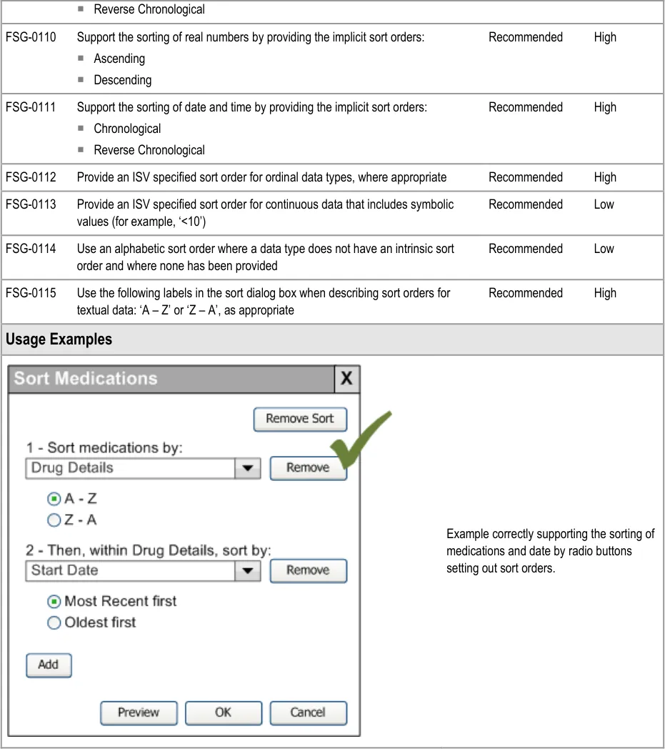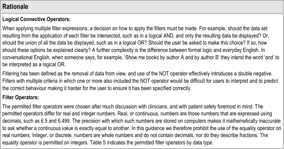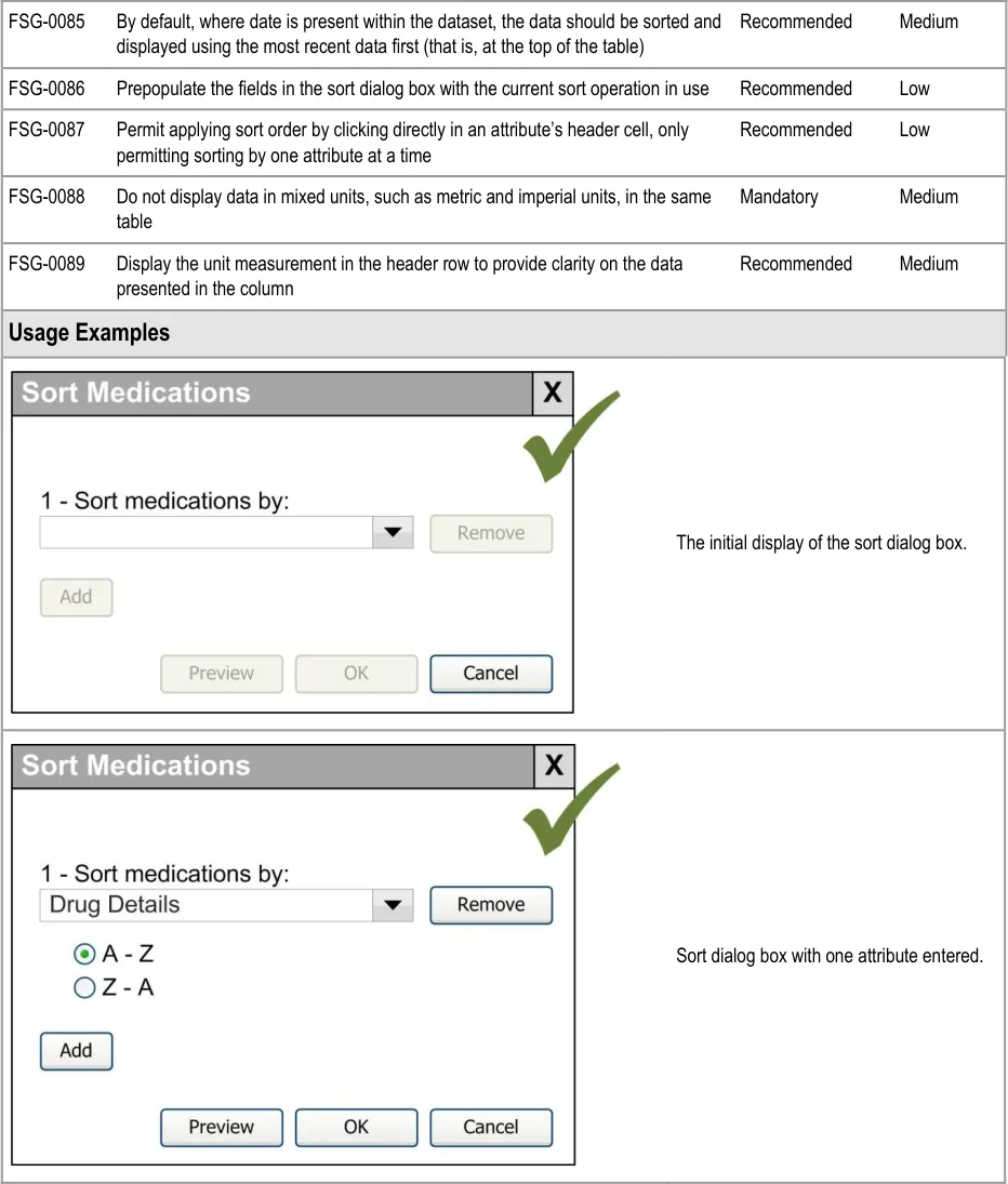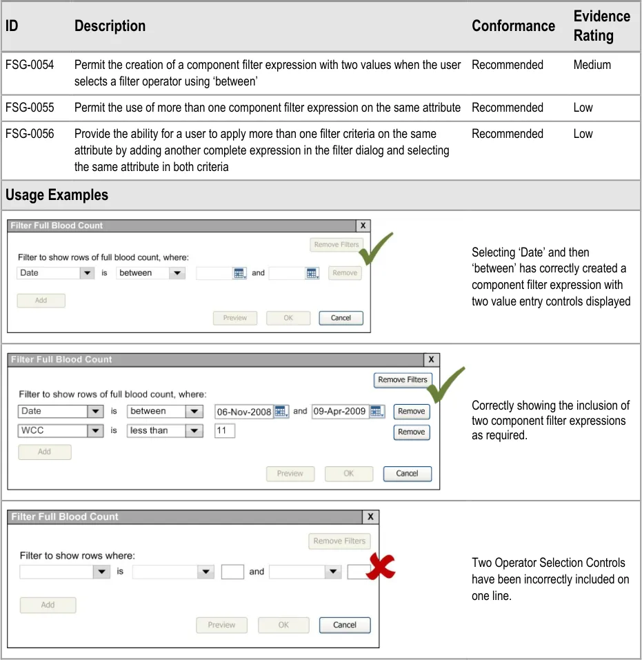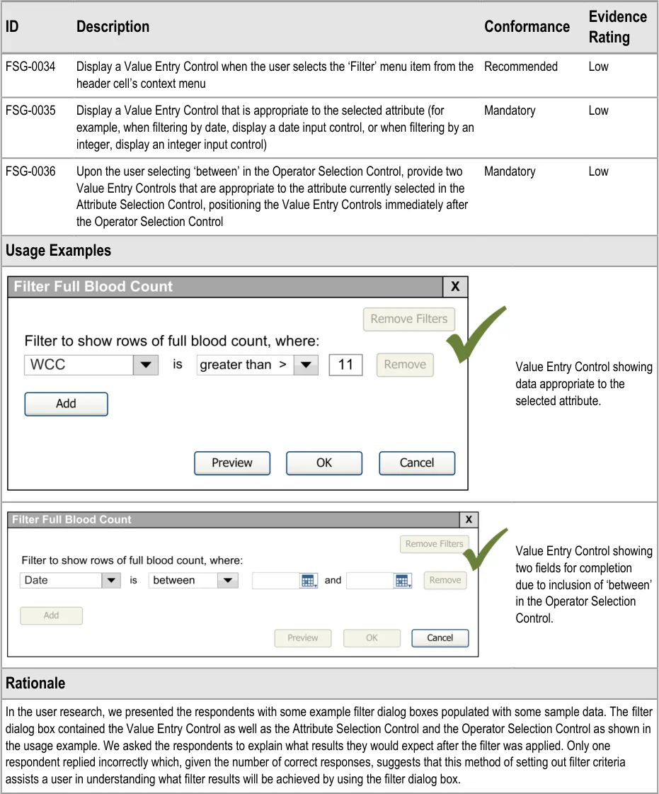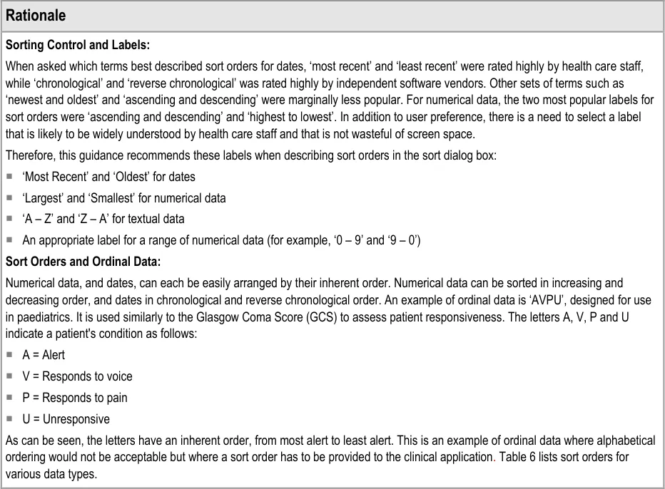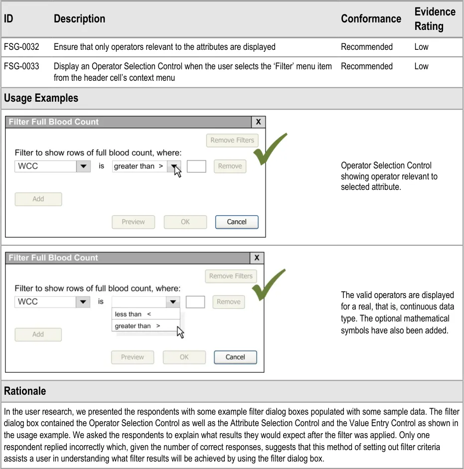 This document provides guidance for the design of application functionality to filter, sort and group any clinical data within a single patient record displayed in a tabular form. It describes the area of focus, lists mandatory and recommended guidance points with usage examples and explains the rationale behind the guidance.