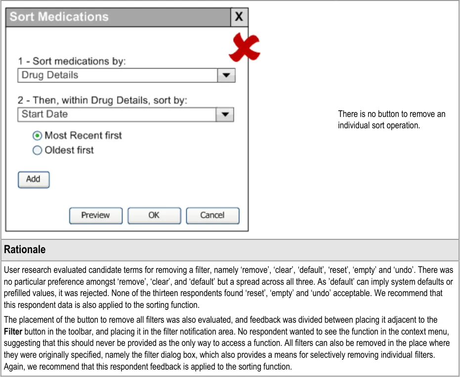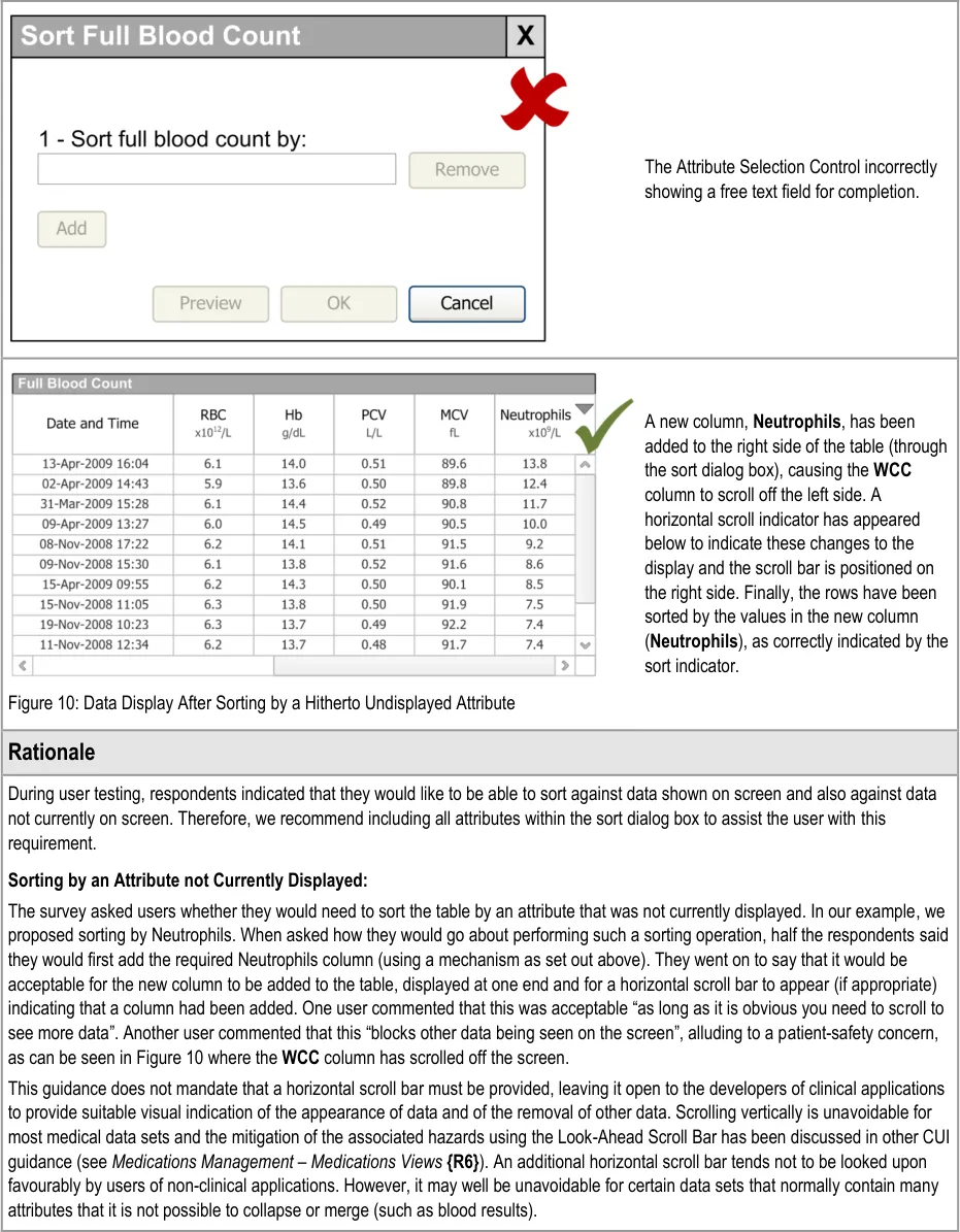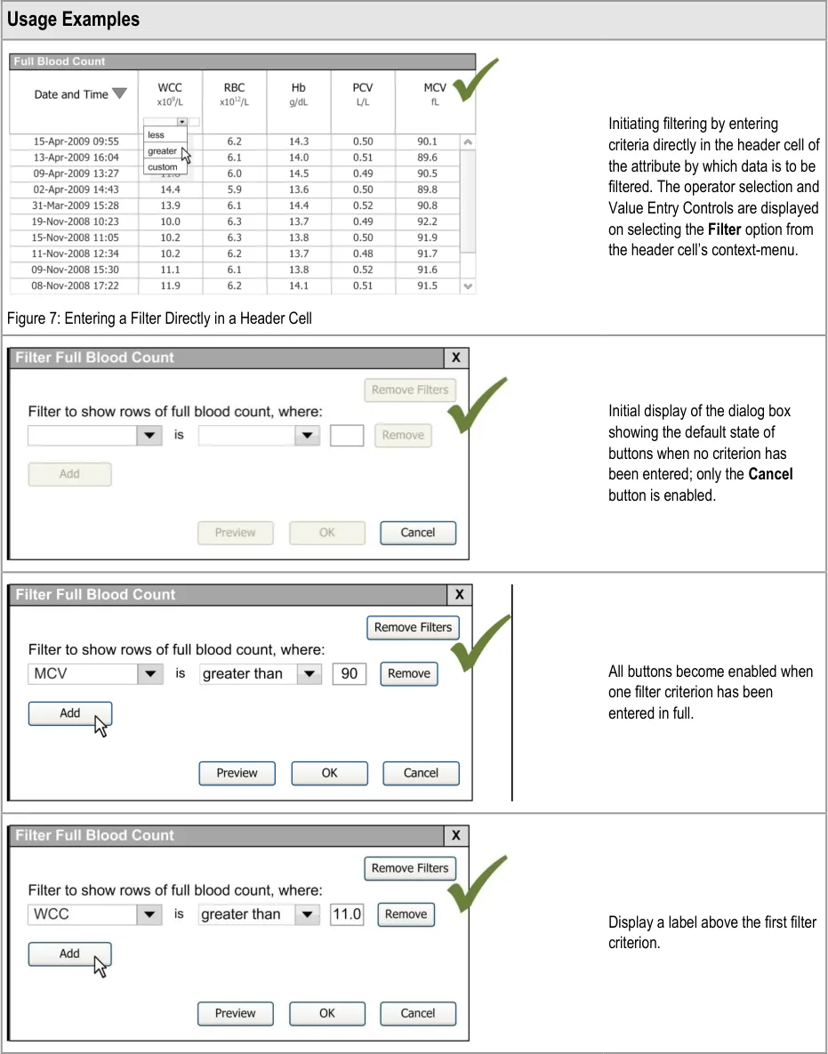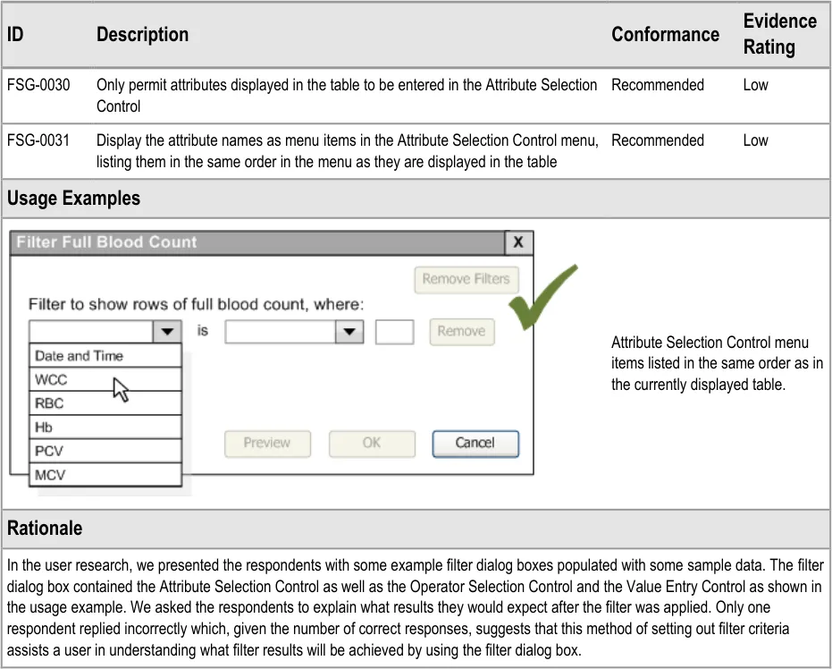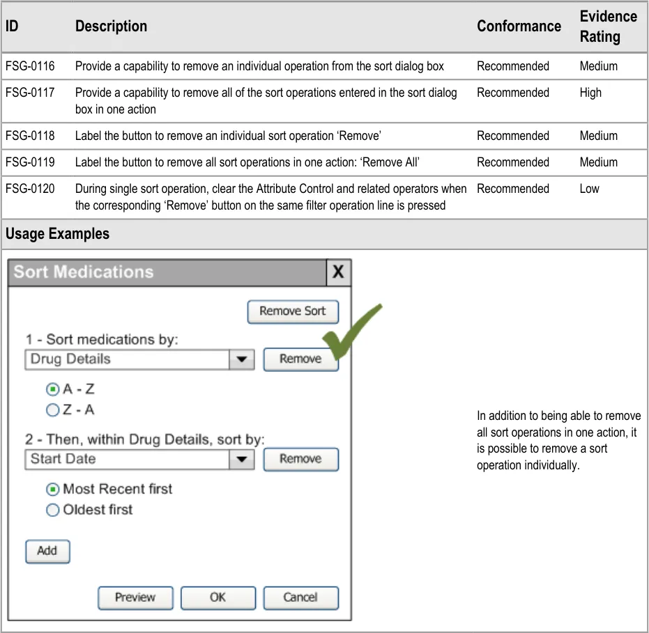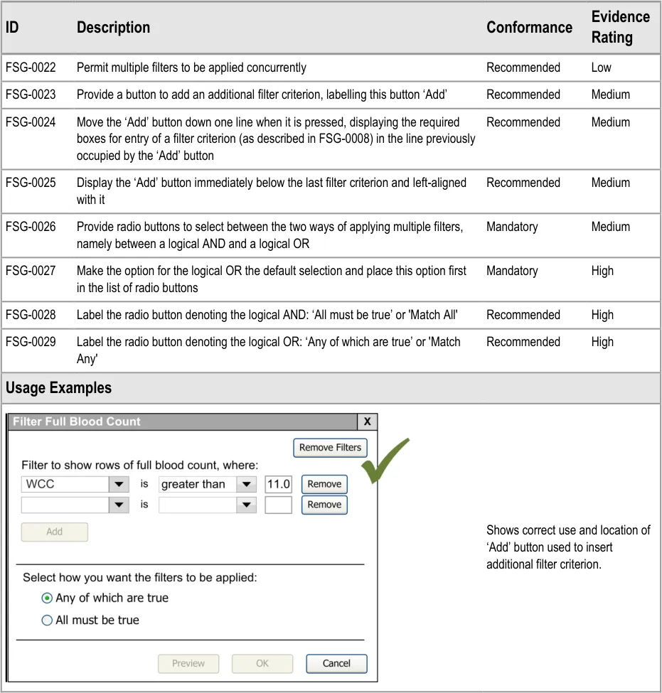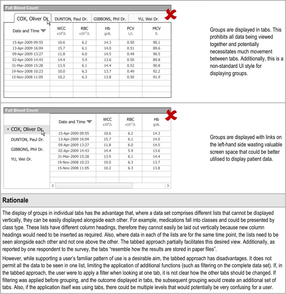 This document provides guidance for the design of application functionality to filter, sort and group any clinical data within a single patient record displayed in a tabular form. It describes the area of focus, lists mandatory and recommended guidance points with usage examples and explains the rationale behind the guidance.