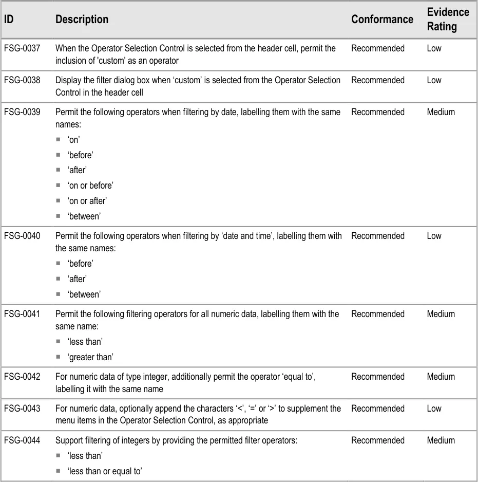 A very constrained subset of possible functionality in the areas of filtering, sorting and grouping has been considered in the development of this guidance. To the same extent, this guidance will only work with a subset of the kinds of data which will be typical. The limitations to functionality and data sets are described below.