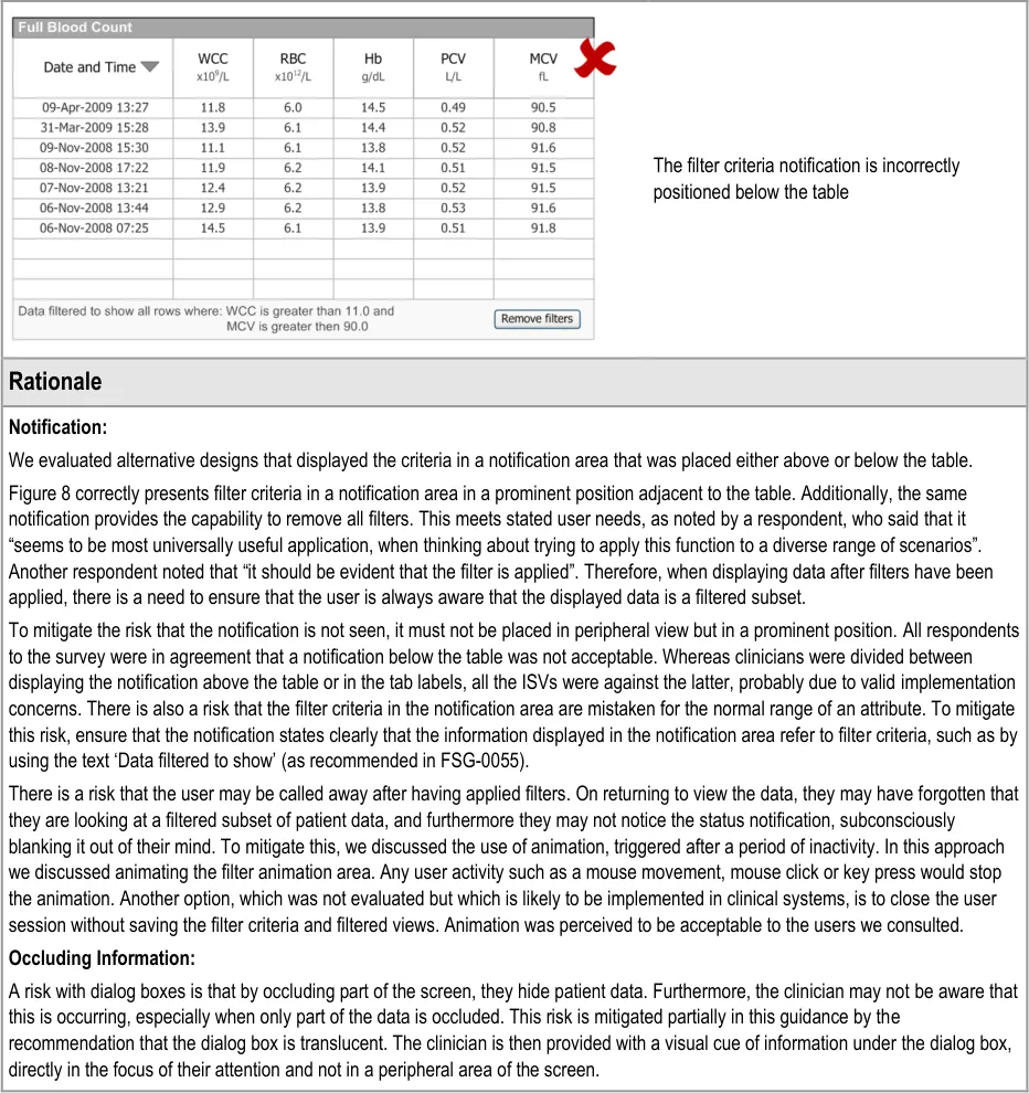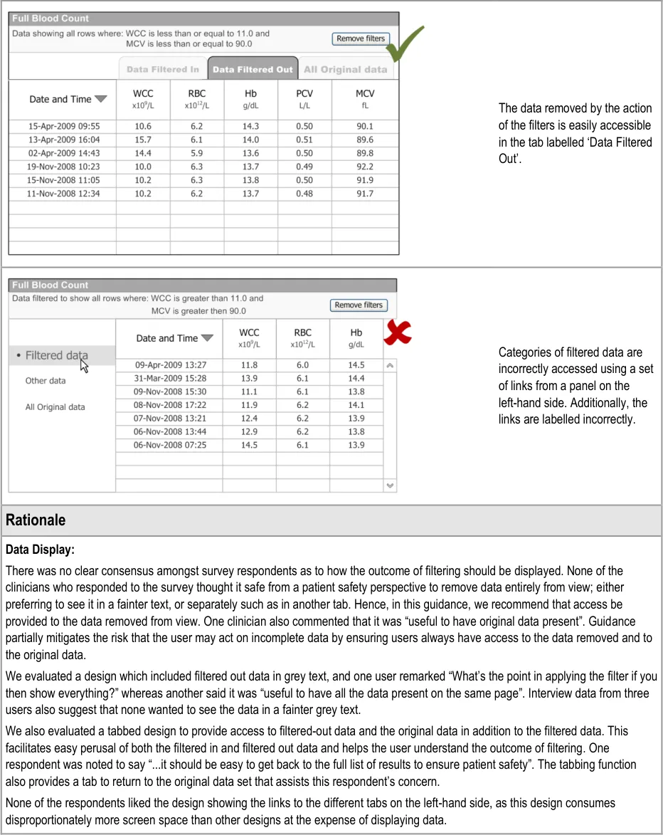 There was no clear design option preferred by the HCP for safely indicating the existence of filtered-out data. None of the HCP believed that completely removing the data from view was a patient safe option while this was the option preferred by some ITPs (3/7).
