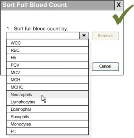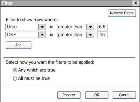 No respondents expected the combined filter in Figure 15 to show results that include either a Urea value greater than 6.5 or a CRP value greater than 15. i.e. a logical OR was not expected. No respondents wanted the filter to show results to combine filters with a logical OR.