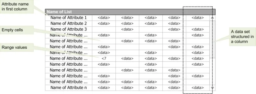 the data is ordered horizontally (that is, where the first entry in each row states the name of the attribute and the remaining cells in the row display the attribute’s values). These aspects are illustrated in Figure 2