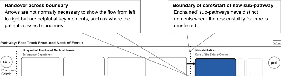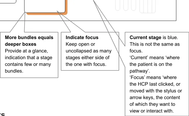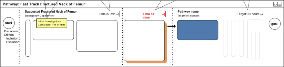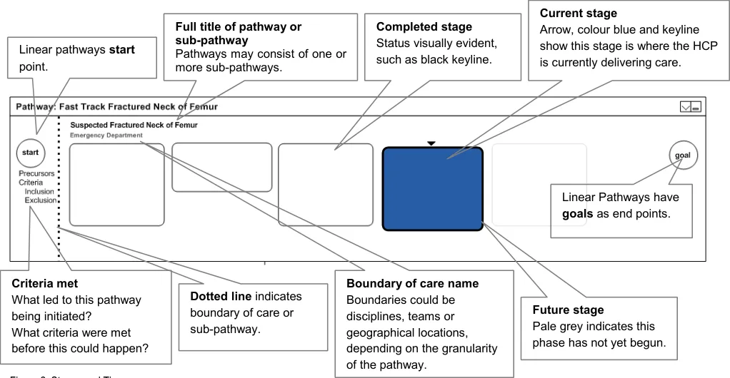 The aim of this document is to explore one example of visualisation style for care pathways that can be seen in section 4.This is an initial investigation, and further research, user testing, patient safety assessment and supplier participation are required to define the final guidance.