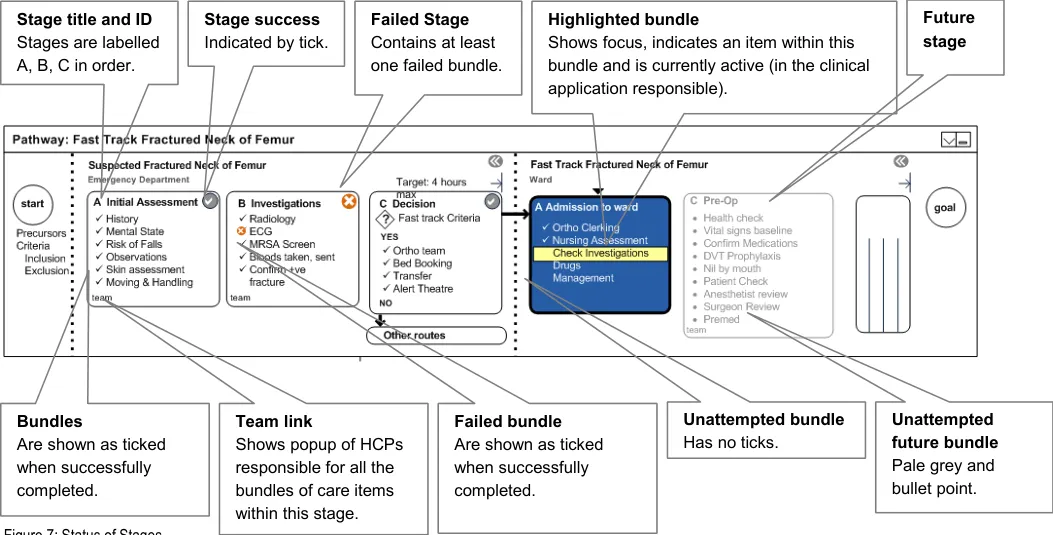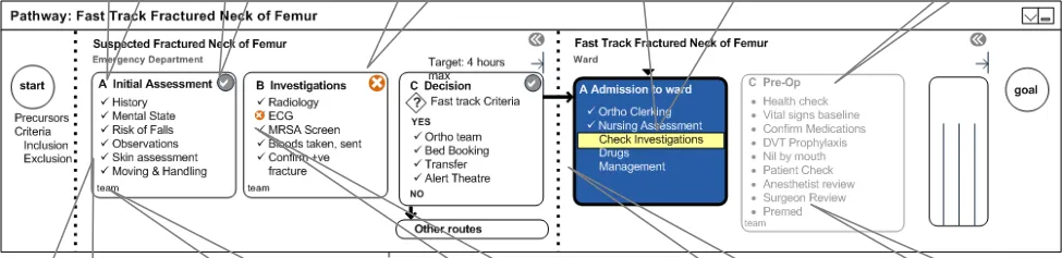 In essence, a care pathway comprises a set of stages of care. Each stage of care has associated bundles of care activity, which defines what should be recorded about the care. In addition, it should be delivered in such a way that any variance between proposed and actual care can be audited, and local practice refined accordingly. Once a stage of care is assigned to a patient, it becomes a care pathway in-use, which is recorded in the patient record.