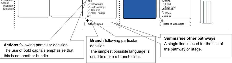A simple visual aid should not make the pathways look like flowcharts, but it would help in flagging key assessment moments.