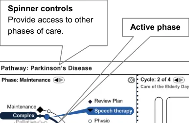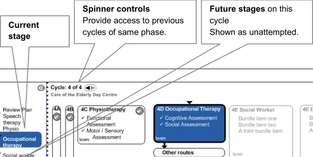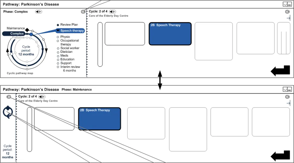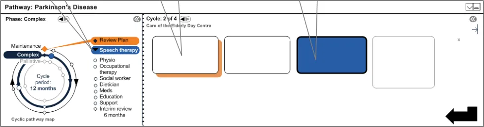 This approach attempts to give overall context of the current care within phases, to show that phases repeat an indeterminate number of times, and to provide access to previous phases.
