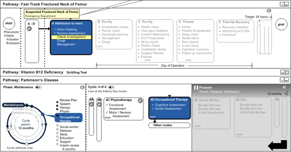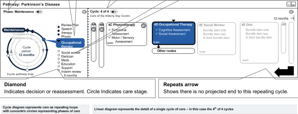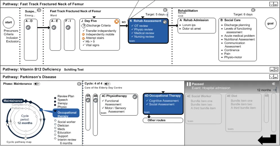 The level of detail that can be shown on these views is rather limited. In addition, they give the impression that the kind of stages and bundles of care items on a long term pathway are fundamentally different in nature to those on a linear pathway, which in practice, is not true. Patients still do get investigated, assessed and treated.