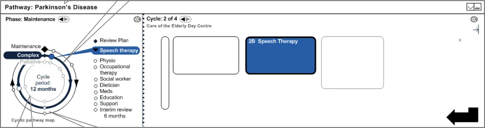 During rehabilitation, the patient’s long term Parkinson’s Disease pathway is restarted. The social worker is able to pay visits to the patient in the rehabilitation unit. The design in Figure 20 also demonstrates the use of the hospitalisation event to indicate that something happened between the stages.