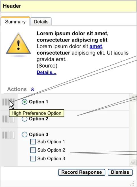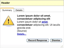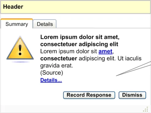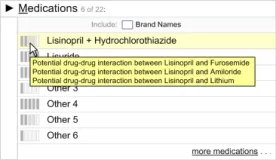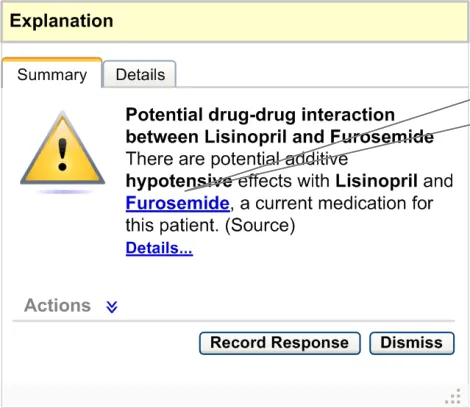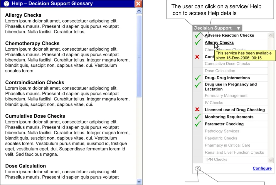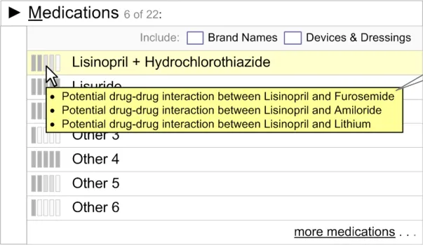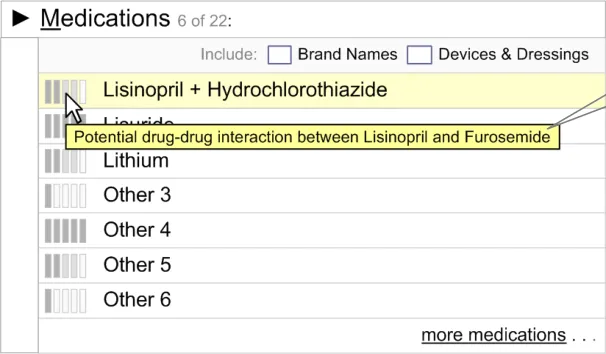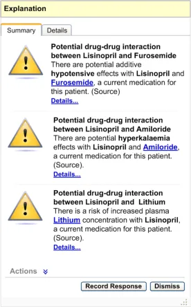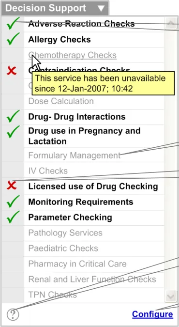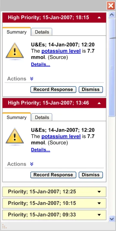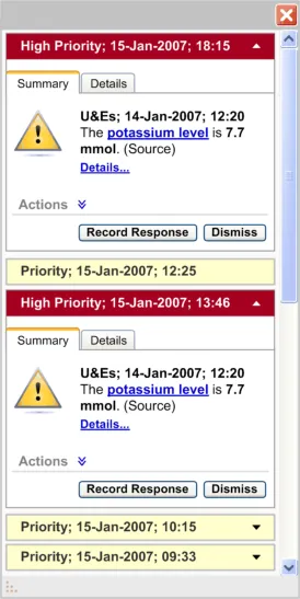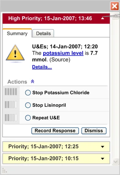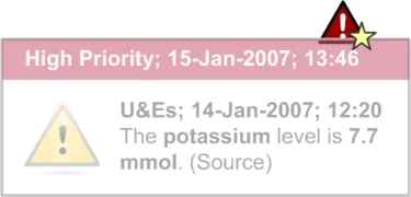 The user interface for Knowledge and Decision Support contains a set of fundamental elements that provide a mechanism for informing the user of important, relevant information, notifications and alerts for a specific patient within areas such as medication management and clinical testing, as illustrated in Figure 2.