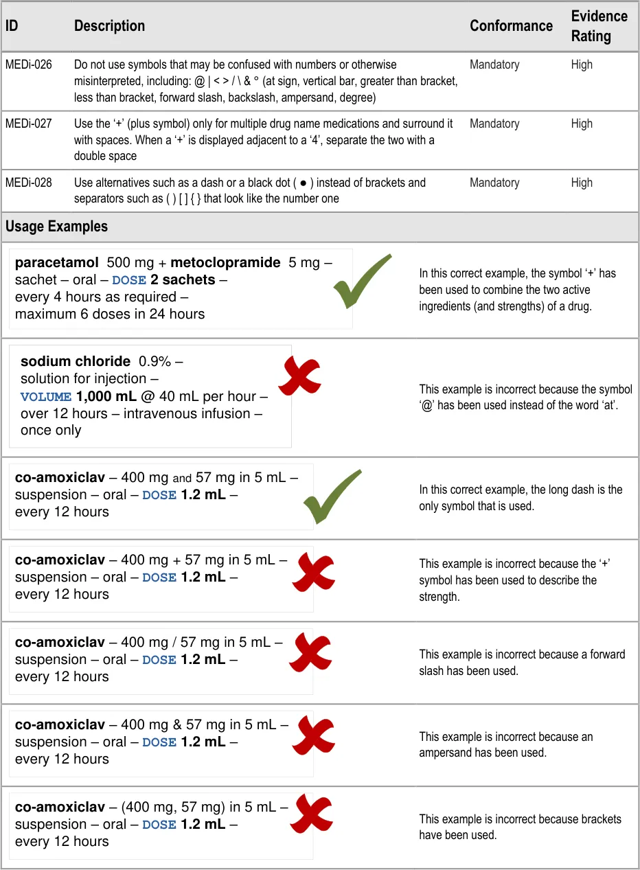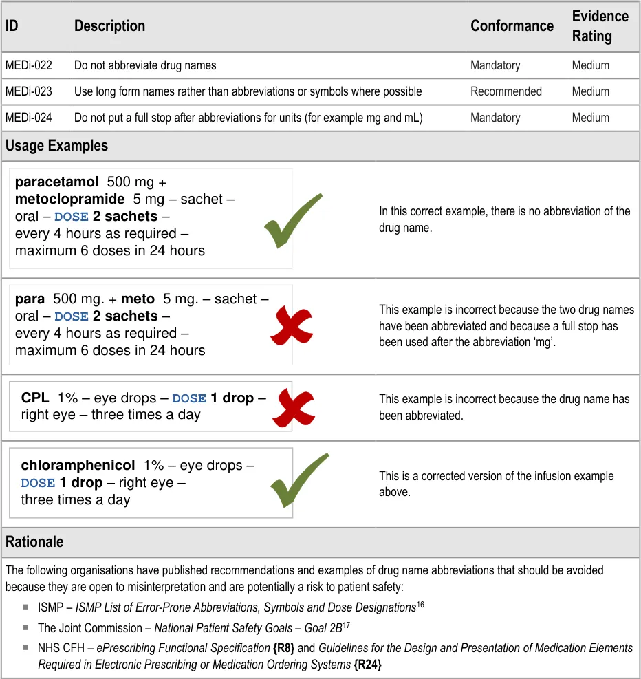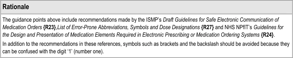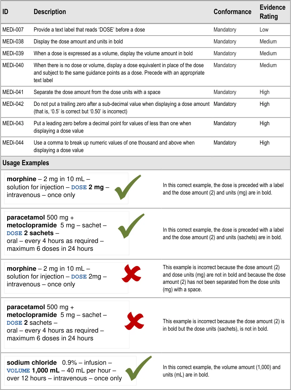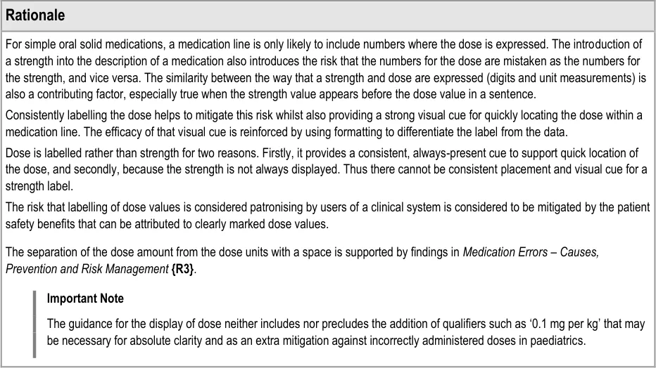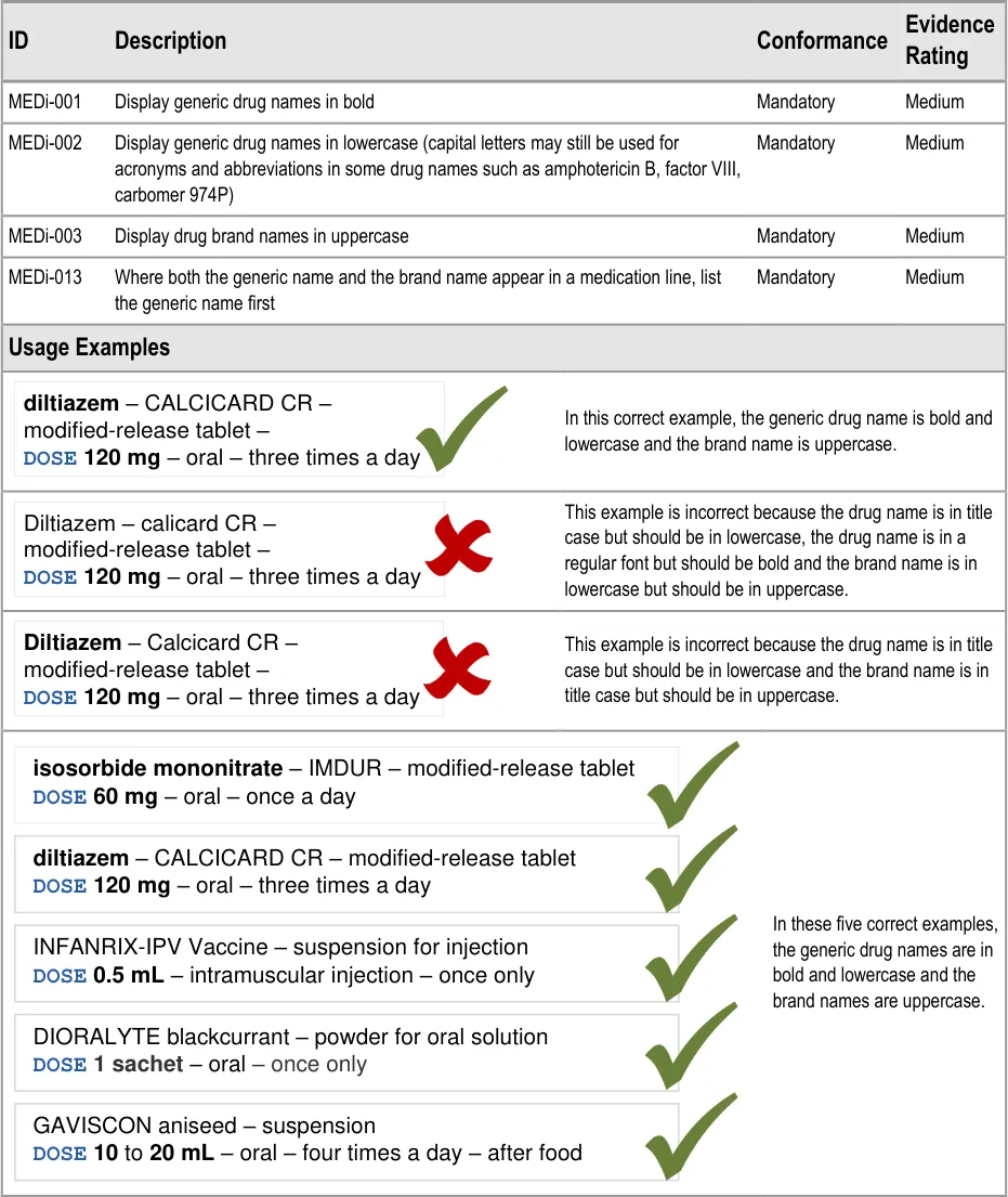 This guidance has been designed for the display of medications for a single patient in a hospital ward environment. The guidance applies to the display of the details of a medication including drug name, strength, form, dose, route and frequency. The additional information about medication required for safe medication management, review and modification is out of scope.