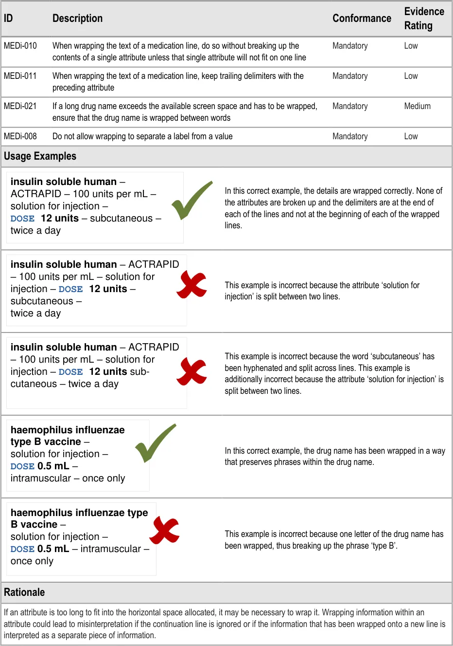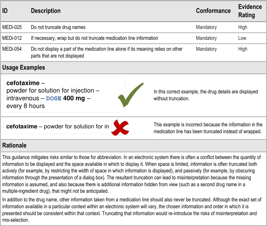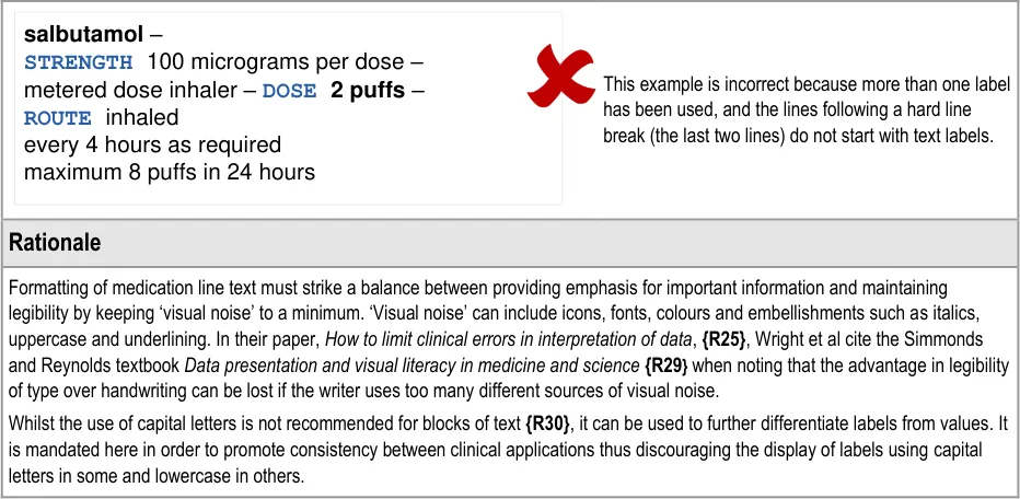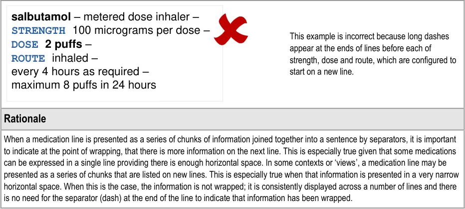 Generic rules for the display of medication including wrapping, truncation, abbreviation, spacing, fonts formatting and labelling