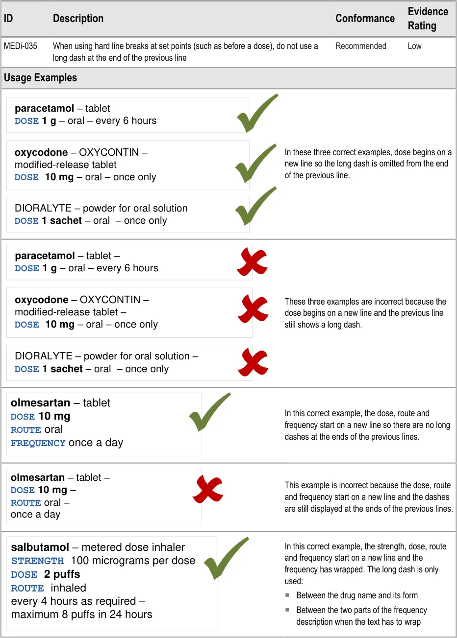 MEDi-035 3.3.9 When using hard line breaks at set points (such as before a dose), do not use a long dash at the end of the previous line
