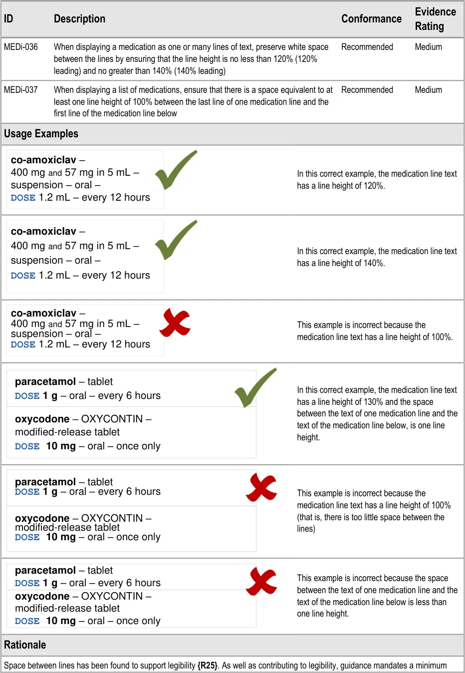 MEDi-036 3.3.10 When displaying a medication as one or many lines of text, preserve white space between the lines by ensuring that the line height is no less than 120% (120% leading) and no greater than 140% (140% leading)