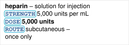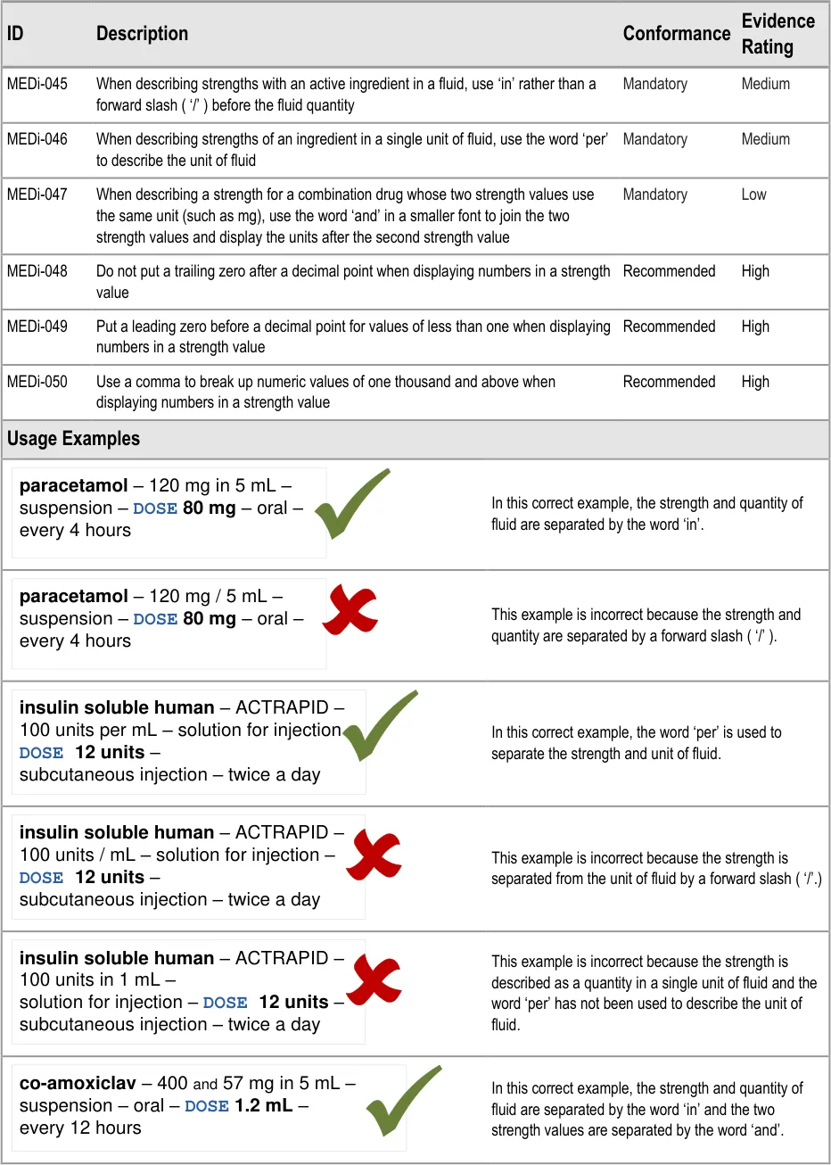 MEDi-045 3.3.12 When describing strengths with an active ingredient in a fluid, use ‘in’ rather than a forward slash ( ‘/’ ) before the fluid quantity