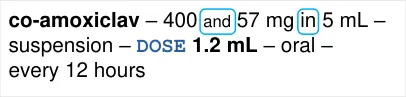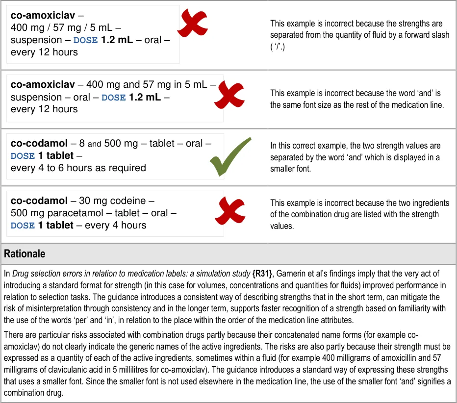 MEDi-047 3.3.12 When describing a strength for a combination drug whose two strength values use the same unit (such as mg), use the word ‘and’ in a smaller font to join the two strength values and display the units after the second strength value