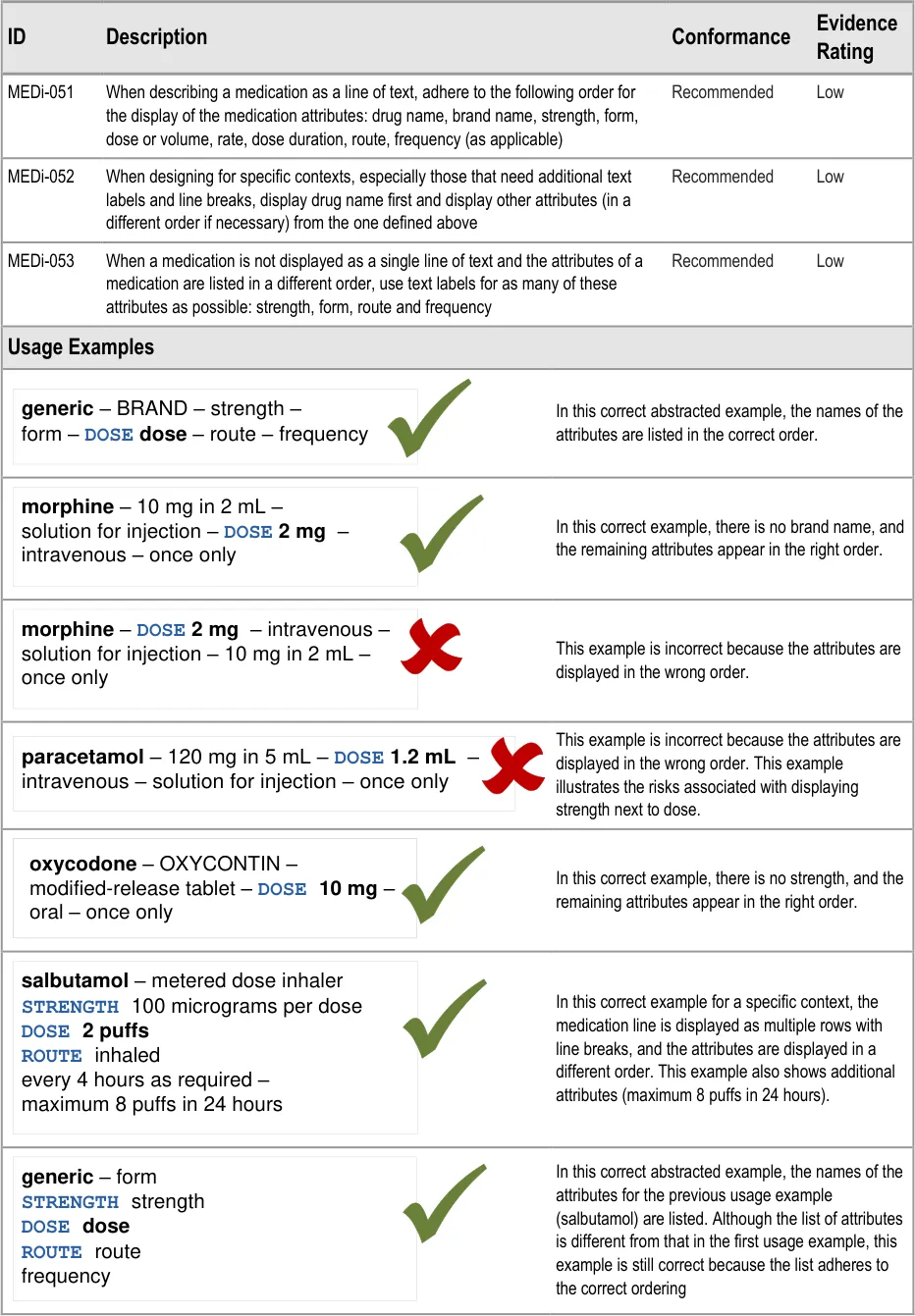 MEDi-051 3.3.13 When describing a medication as a line of text, adhere to the following order for the display of the medication attributes: drug name, brand name, strength, form, dose or volume, rate, dose duration, route, frequency (as applicable)