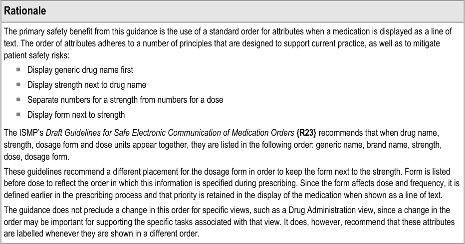 Anecdotal references to medication errors most frequently describe problems with legibility of handwritten scripts, the use of abbreviations, translation errors in verbal communications and mistakes exacerbated by similar looking bottles or product labels and similar looking or similar sounding drug names. These well-documented errors focus on specific elements of a medication order, as do the means by which we mitigate them. In addition to these specific errors, there is a need to ensure that medications orders are more thorough in terms of the information they contain, and that they are created, structured, displayed and communicated in a consistent way. Mitigations of this kind may also address the specific errors described above, by providing additional information in a medication order in a way that leaves less room for misinterpretation.