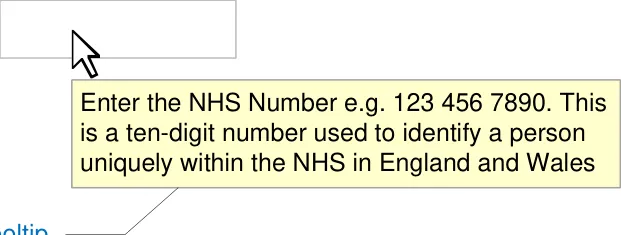 The wording of hints and prompts is left to the designers of NHS clinical applications. Examples of hints, prompts, and tooltips are shown below.