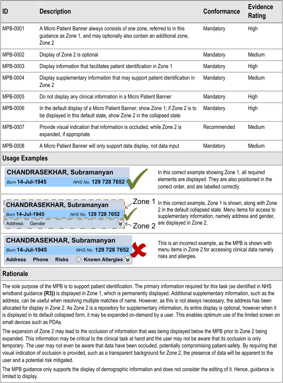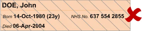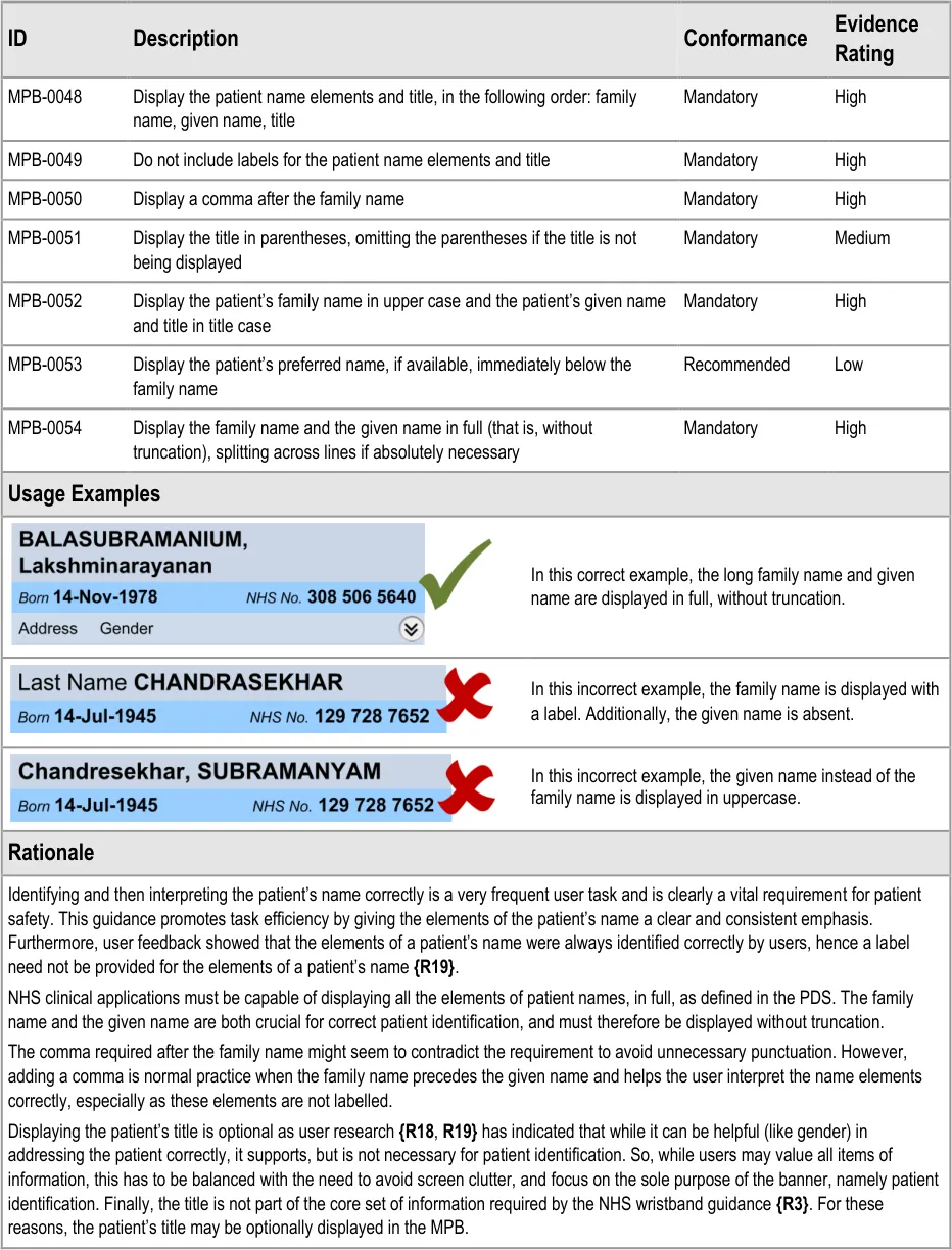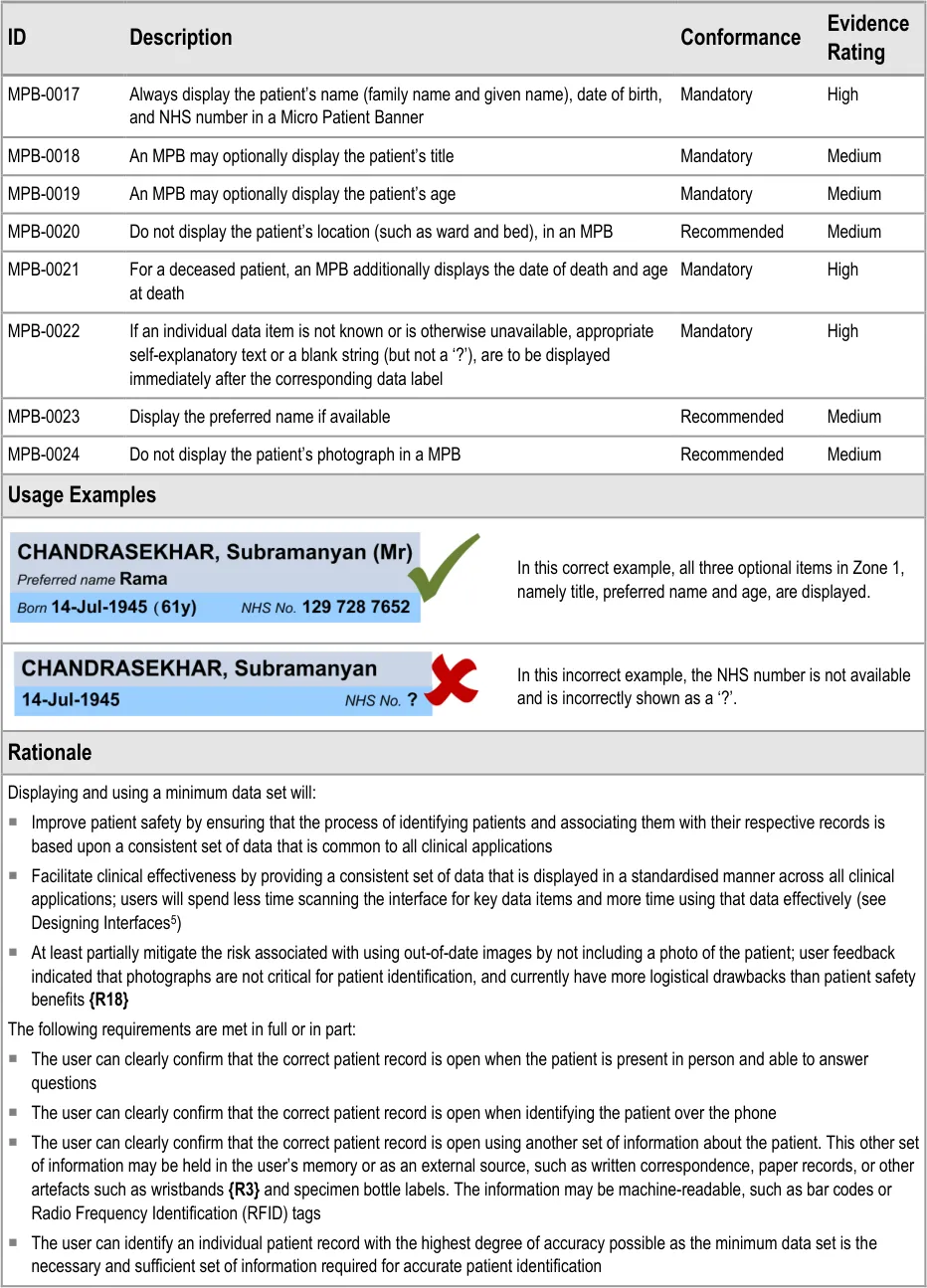 The National Patient Safety Agency (NPSA) [1] states that, although there are no accurate figures on the frequency or cost of mismatching errors, they form a significant part of the whole range of errors in health care. These mismatches can occur between a patient, their record, laboratory results and, in the case of inpatients, their wristband. Whilst the wide variation in wristbands used in the NHS has now been addressed by a standard [2], there is considerable variation in patient banner layout across applications, which has already been the subject of CUI guidance {R1} . When errors do occur, they are typically one of three main types {R2} :