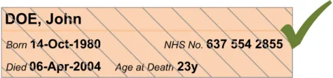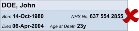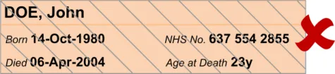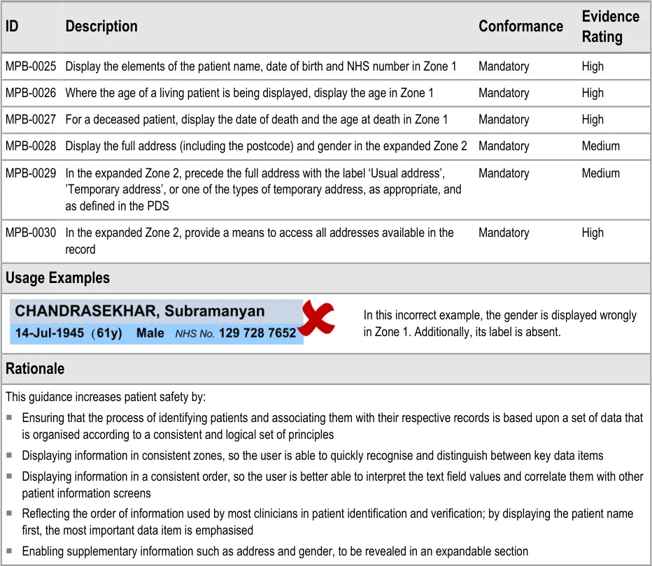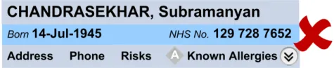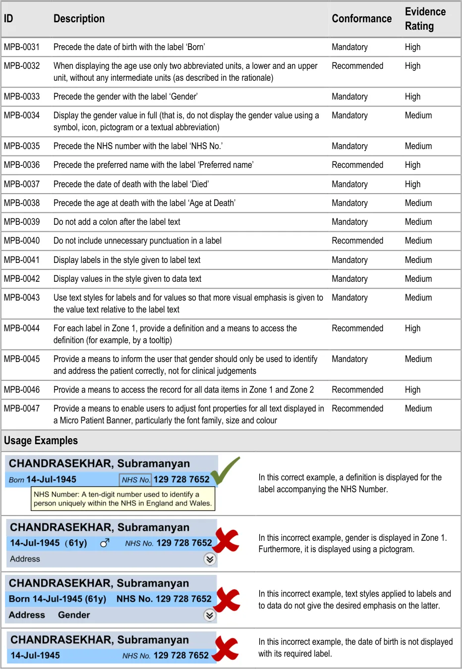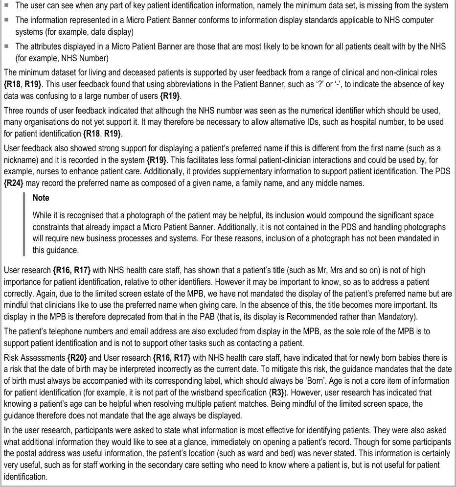 The National Patient Safety Agency (NPSA) [1] states that, although there are no accurate figures on the frequency or cost of mismatching errors, they form a significant part of the whole range of errors in health care. These mismatches can occur between a patient, their record, laboratory results and, in the case of inpatients, their wristband. Whilst the wide variation in wristbands used in the NHS has now been addressed by a standard [2], there is considerable variation in patient banner layout across applications, which has already been the subject of CUI guidance {R1} . When errors do occur, they are typically one of three main types {R2} :