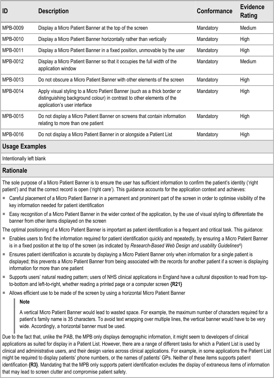This document provides guidance for the design of a Micro Patient Banner (MPB). It describes the area of focus, lists mandatory and recommended guidance points with usage examples and explains the rationale behind the guidance.