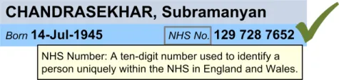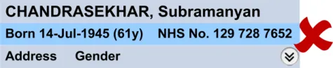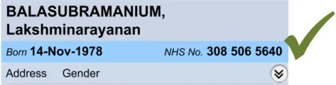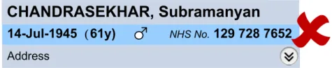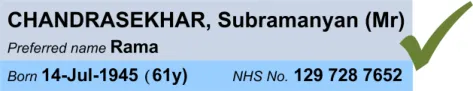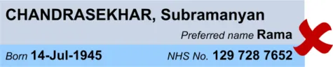 The term ‘patient banner’ (PAB) refers to the area of the user interface that contains demographic information for a patient record. The patient banner is the area within the user interface that is most often used to match records with patients and contains key information for identifying patients, such as name, address, date of birth, and NHS number. This information may be matched with that provided by the patient (or a third party, such as a parent), usually in their presence or over the telephone. Information in a patient banner may also be matched with that in any of the patient’s associated artefacts, such as samples, letters, specimens, wristbands and X-rays.