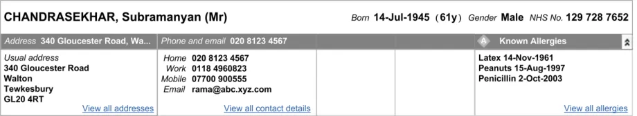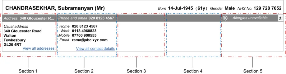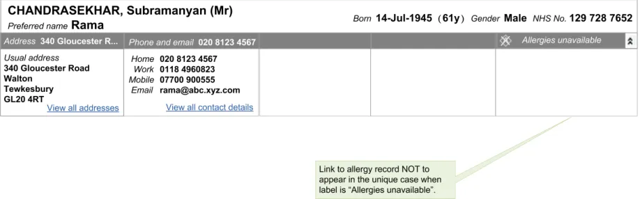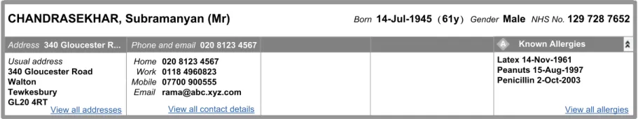 The term “patient banner” refers to the area of the user interface that contains header information for a patient record. The patient banner is the area within the user interface that is most often used to match records with patients and contains key information for identifying patients, such as name, address and date of birth. This information may be matched with that provided by the patient (or a third party, such as a parent), usually in their presence or over the telephone. Information in the patient banner may also be matched with that in any of the patient’s associated artefacts, such as samples, letters, specimens, wristbands and X-rays.
