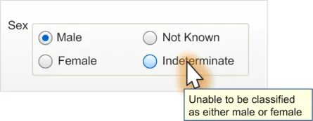 This document describes the design guidance for the display and input of information about patient ‘Sex’ or ‘Current Gender’ status. It describes the area of focus, provides guidance and recommendations, and explains the rationale behind the guidance and recommendations.