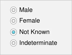 | Male Female Not Known Indeterminate | Male Female Not Known Indeterminate |